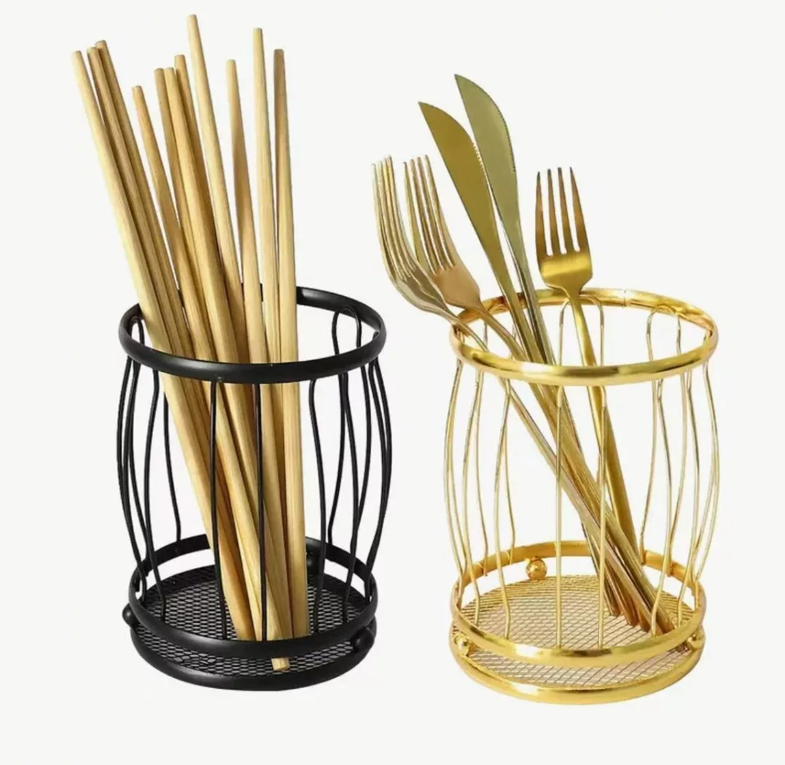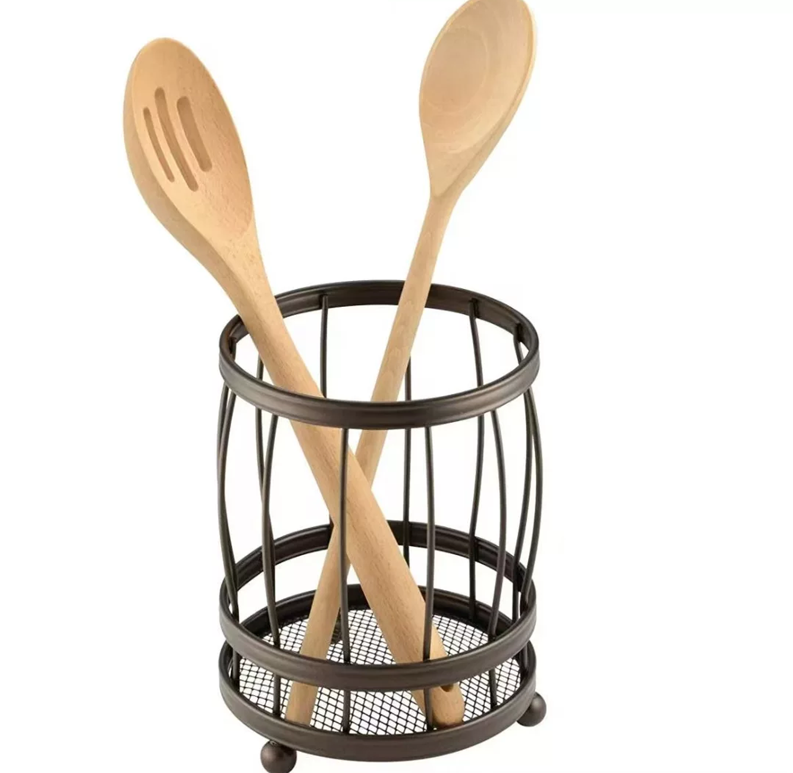 Keep your kitchen drawers clutter-free and your essential tools within easy reach with this highly functional metal cutlery holder. Constructed from a strong and durable metal with a stylish aged finish, this organizer is built for longevity in busy environments. Its spacious cylindrical design is ideal for holding a variety of items, including cooking spoons, forks, knives, and a range of other common kitchen tools. The key feature is the open, airy design combined with a sturdy mesh base, which facilitates quick drying of freshly washed utensils and allows for easy cleaning. This versatile and attractive piece is perfect for enhancing organization and aesthetics in the home, as well as in professional settings like hotels or restaurants.