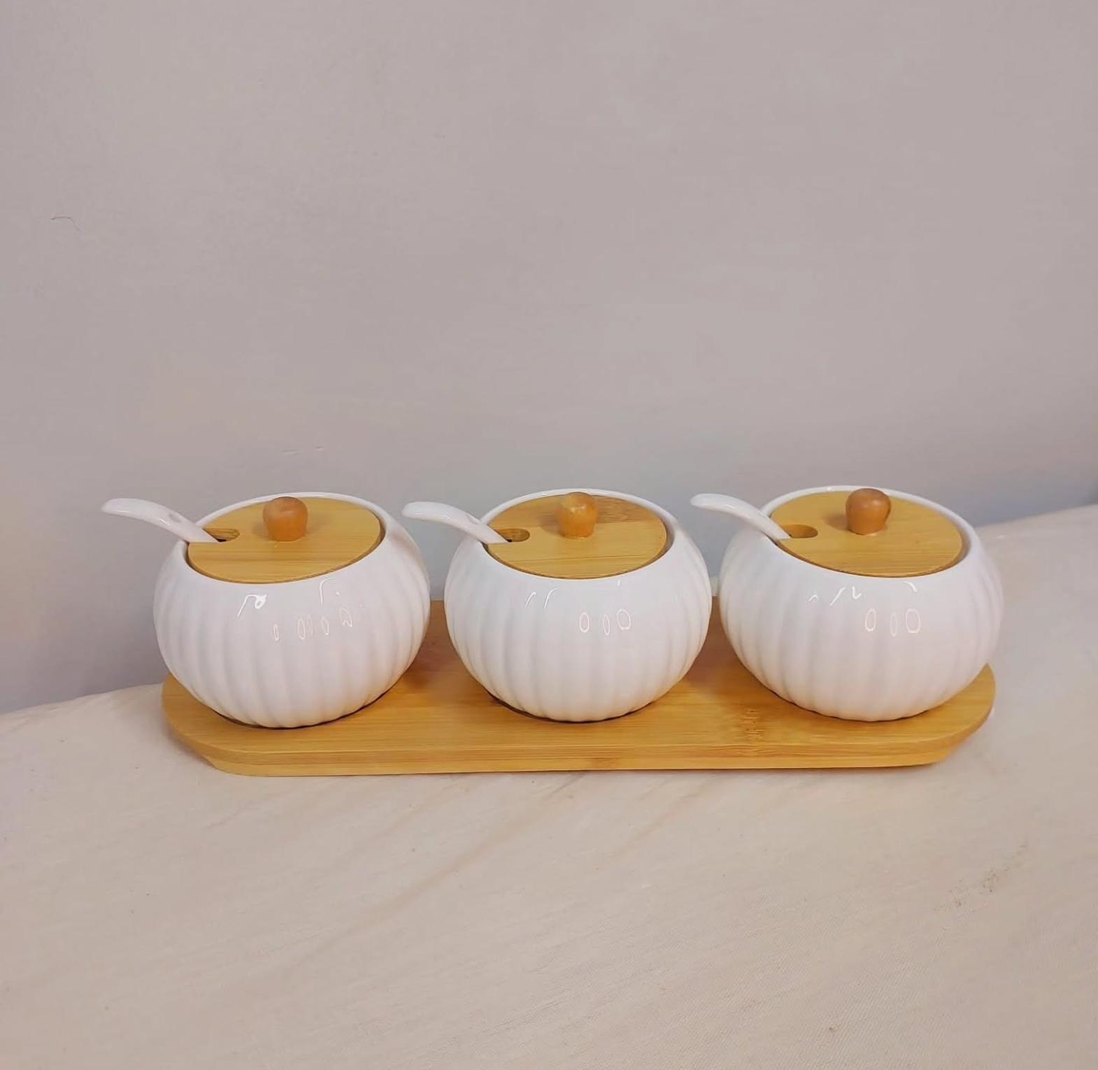 Organize your kitchen counter or dining table with this elegant 3-Piece Ceramic Seasoning Canister Set with Bamboo Tray and Spoons. This set includes three high-grade porcelain canisters, each designed to hold your essential seasonings. Each canister comes with a natural bamboo lid for an airtight seal, keeping your spices fresh, along with a dedicated ceramic serving spoon.