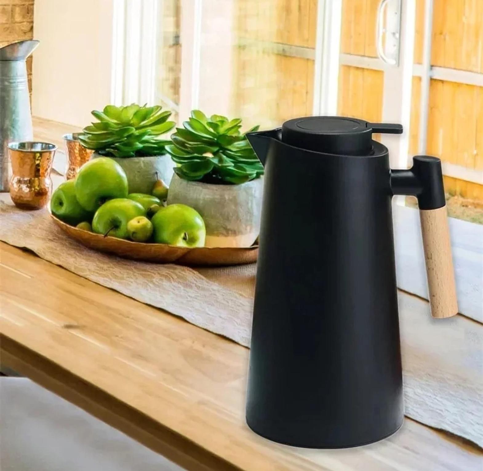 The flask is crafted from robust PP material, ensuring long-lasting durability. Its thoughtful design includes a convenient push-up button for effortless pouring, minimizing spills and heat loss. For easy maintenance, the flask is simple to clean, ensuring hygiene with every use. A beautifully integrated wood handle provides a comfortable grip and adds a touch of natural elegance to its contemporary design, making it a perfect addition to any kitchen or office setting.