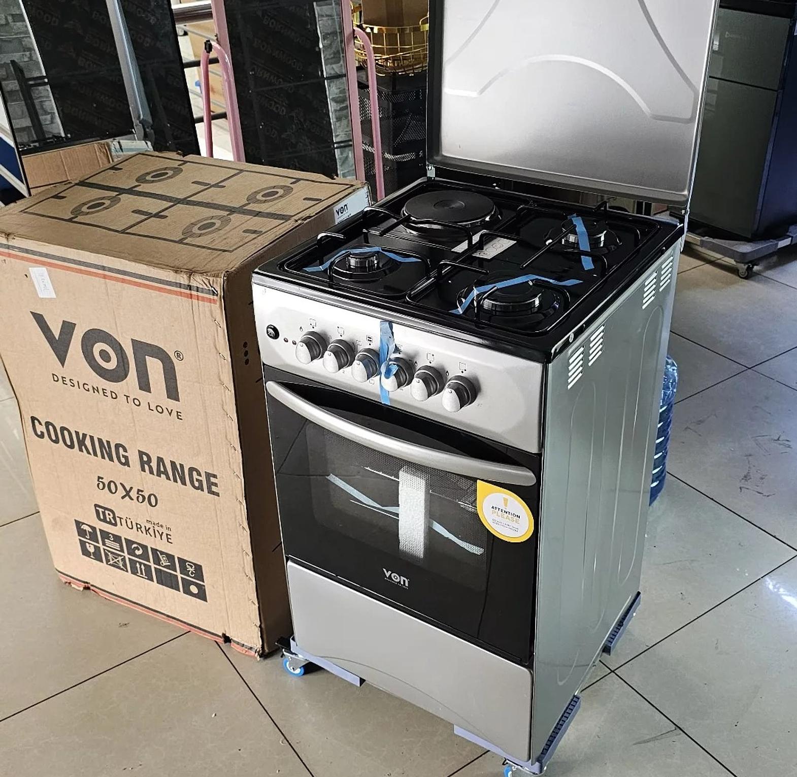 The integrated Electric Oven delivers consistent, precise baking and roasting results, ensuring your meals are cooked to perfection every time. Equipped with durable pipe burners, this cooker is built for long-lasting performance and efficient cooking, saving you time and energy. The enamel-coated grid is not only easy to clean but also resistant to wear, ensuring enduring durability and a pristine appearance. Enjoy hassle-free operation with the convenient button ignition, providing quick and seamless burner lighting. A stylish metal lid protects your cooktop when not in use, adding a sleek and organized touch to your kitchen. To further enhance your cooking experience, the Von Cooker comes with essential accessories, including 1 tray and 1 wire grid for versatile oven use. This Enamel Grey cooker is a reliable and elegant addition to any modern home.