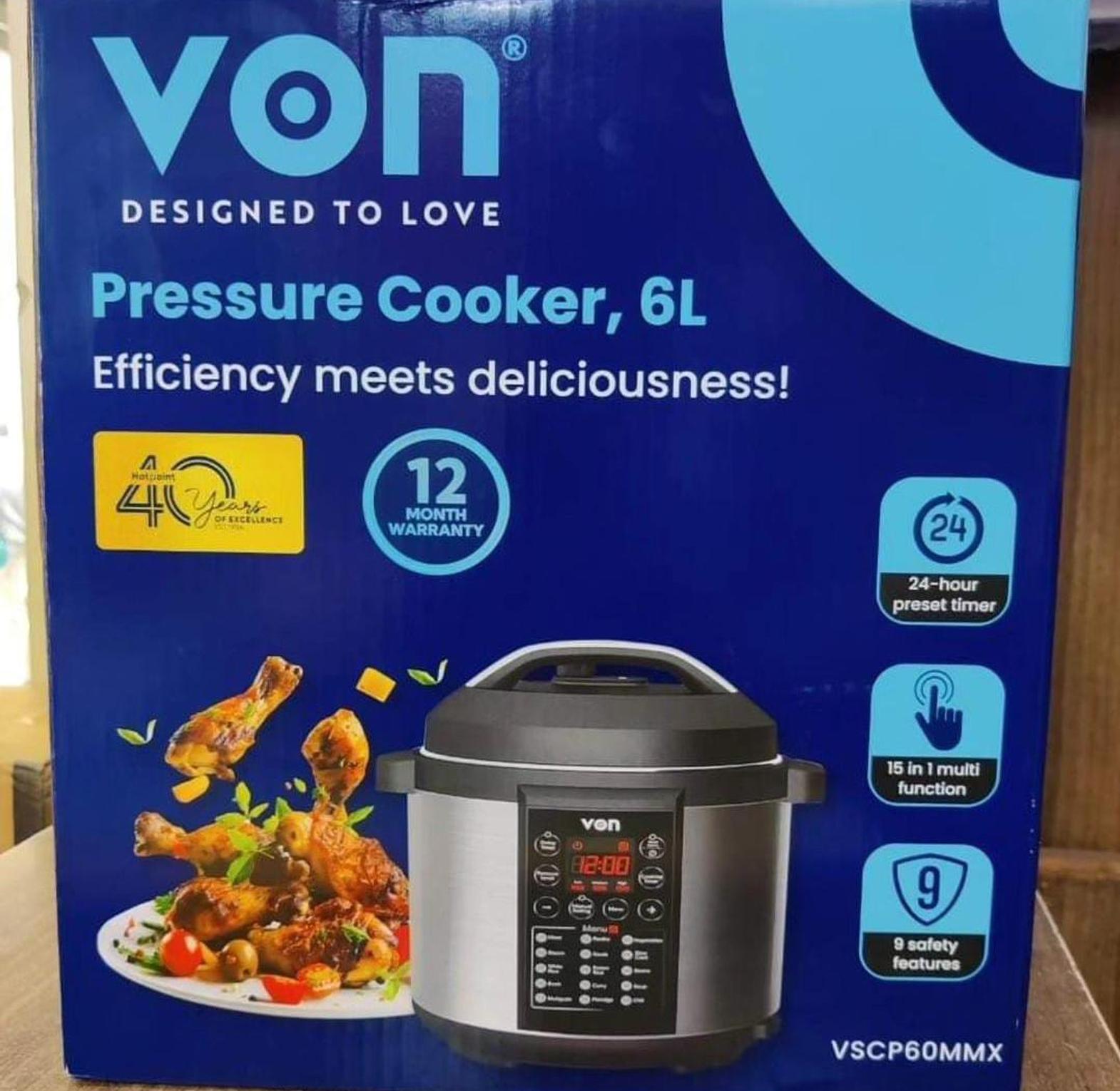 The Von electric pressure cooker is a versatile kitchen essential that revolutionizes the way you prepare meals. With its advanced pressure cooking technology, this appliance significantly reduces cooking times while locking in flavors and nutrients, making it ideal for busy families and meal prep enthusiasts. Featuring multiple cooking functions, including pressure cooking, slow cooking, sautéing, and steaming, it allows you to create a wide variety of dishes with ease. The intuitive digital control panel offers pre-set cooking programs and adjustable settings for precise temperature and timing. Designed with safety in mind, the Von electric pressure cooker includes multiple safety features, such as a secure lid locking mechanism and pressure release valve. Its sleek design and compact size make it a stylish addition to any kitchen countertop. Whether you're preparing a hearty stew, perfectly cooked rice, or tender meats, the Von electric pressure cooker is your go-to tool for quick and delicious meals.