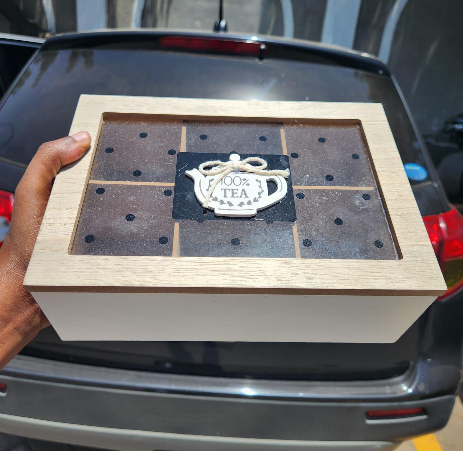 Upgrade your tea storage with our wooden tea bag organizer, priced at 2999/-. Crafted from high-quality wood with a transparent glass top, this organizer adds a touch of elegance to your kitchen or tea station. The glass lid allows you to easily view your tea selection, making it both practical and visually appealing. Perfect for organizing a variety of tea bags, this sturdy and stylish tea box keeps your collection neatly displayed and easily accessible. Ideal for tea lovers, it combines functionality and design, making it a beautiful addition to any home.