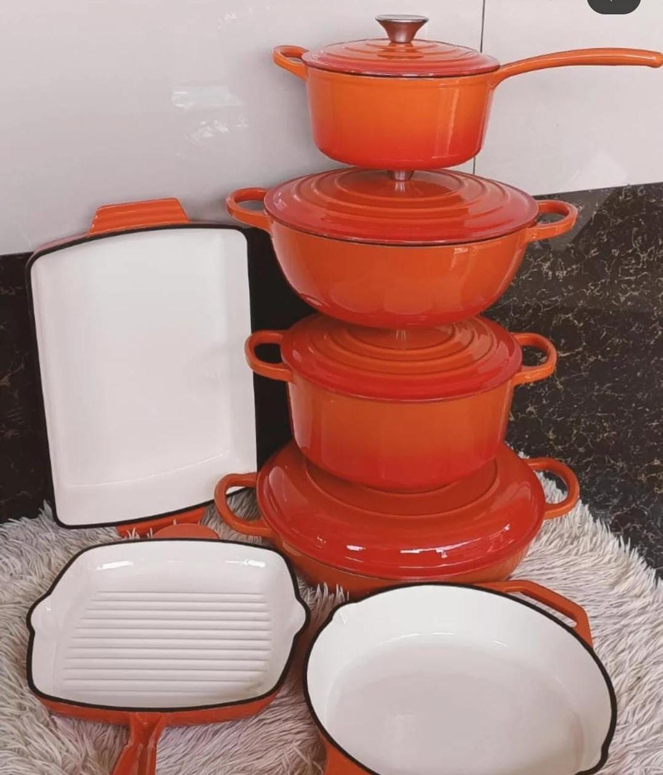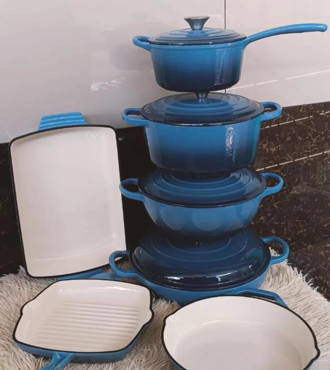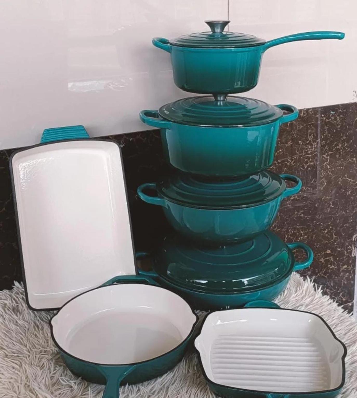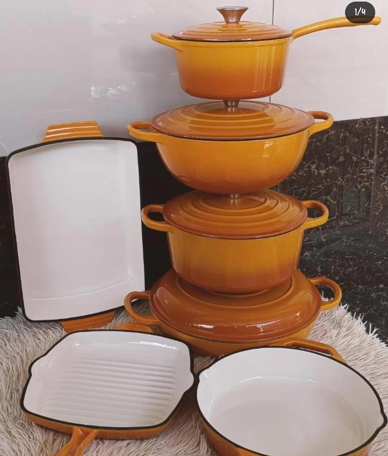 This 11-piece enamel cast iron cooking pot set is a must-have for any kitchen, combining style and functionality in one essential package. Crafted from high-quality cast iron and coated with a durable enamel finish, these pots retain and evenly distribute heat, ensuring perfect results every time. The set includes a variety of sizes, ideal for simmering soups, braising meats, baking bread, or preparing sauces. The vibrant enamel coating not only enhances the look of your kitchen but also makes cleaning easy and quick. Whether you're a professional chef or a home cook, this set offers versatility, durability, and a touch of elegance to elevate your cooking experience.