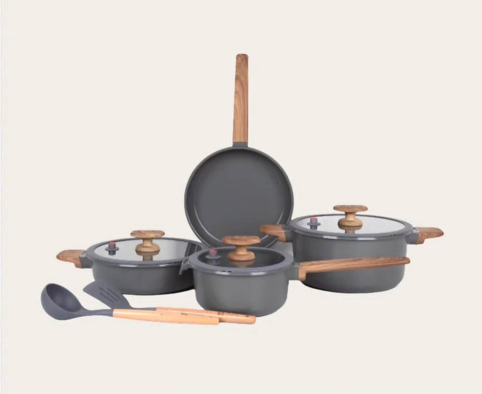 Discover superior meal preparation with the Signature 15-Piece Nonstick Die-Cast Cookware Set, a collection designed for both functionality and aesthetic appeal, available in striking multiple colors. Crafted from robust die-casting aluminum, these pieces boast a high-performance ceramic nonstick coating on both the inside and outside, ensuring comprehensive durability and easy maintenance. Health-conscious users will appreciate that the entire set is guaranteed free from harmful chemicals, including PFAS, PFOA, Lead, and Cadmium. The comprehensive 15-piece assortment covers every cooking task, featuring an 18cm Sauce Pan with Lid, a 24cm Sauce Can with Lid, a large 28cm Casserole, a handy 28cm Sauté Pan with Lid, and two versatile Frying Pans (24cm and 26cm). Furthermore, the collection includes a bonus 5-Piece Silicon Spoons with Stand set. The cookware is designed to be fully dishwasher safe, simplifying your post-meal routine, and features elegant, heat-safe wooden-style handles.