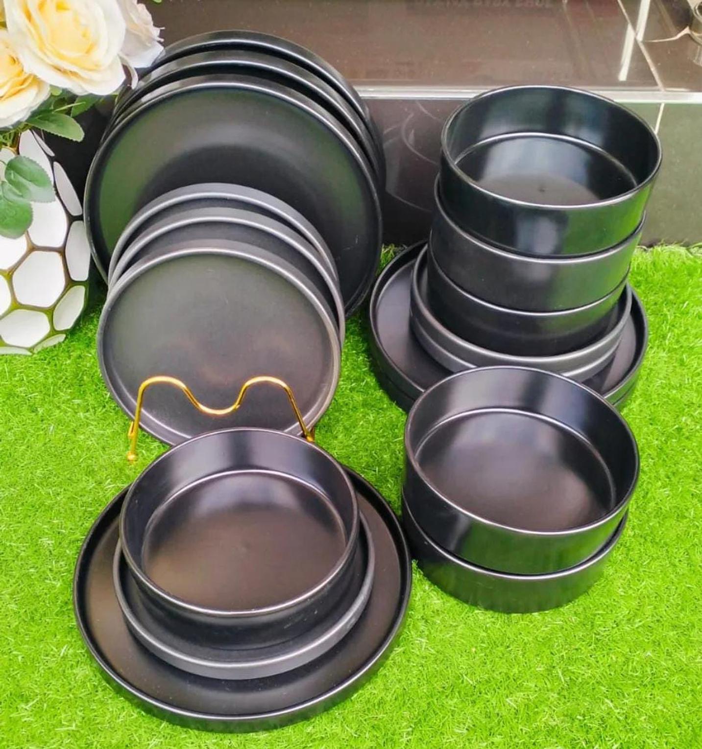 Elevate your dining experience with this 18pcs Black Plain Dinner Set, thoughtfully curated to bring style and simplicity to your table. Featuring six dinner plates, six side plates, and six bowls, each piece is crafted from durable, high-quality ceramic in a smooth matte black finish that complements any table setting. Perfect for everyday use or special occasions, this set combines practicality with bold elegance, making it a timeless addition to both contemporary and classic kitchens. Whether you're hosting guests or enjoying a quiet meal, this dinner set delivers understated sophistication with every bite.
