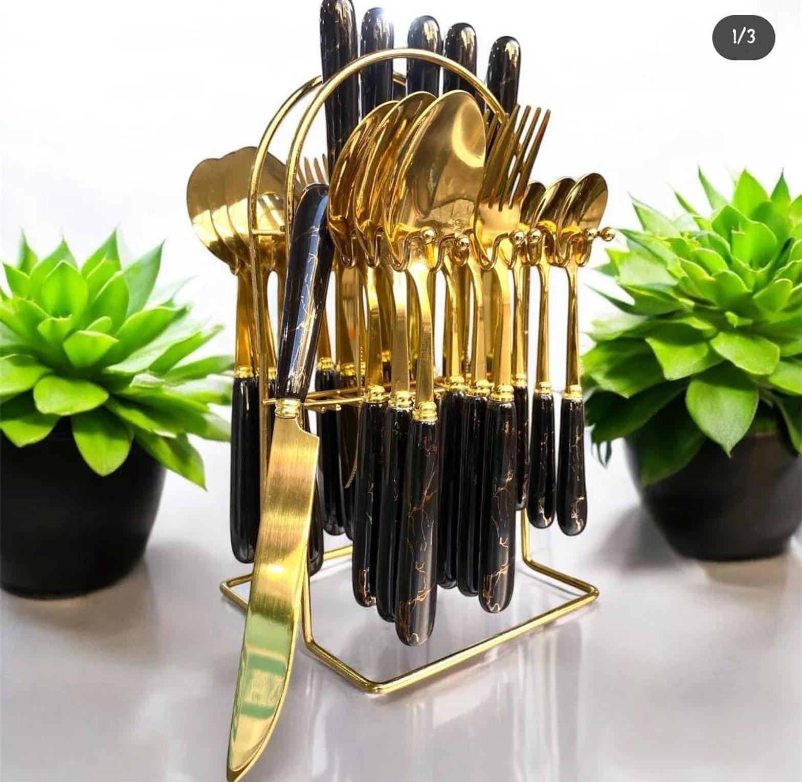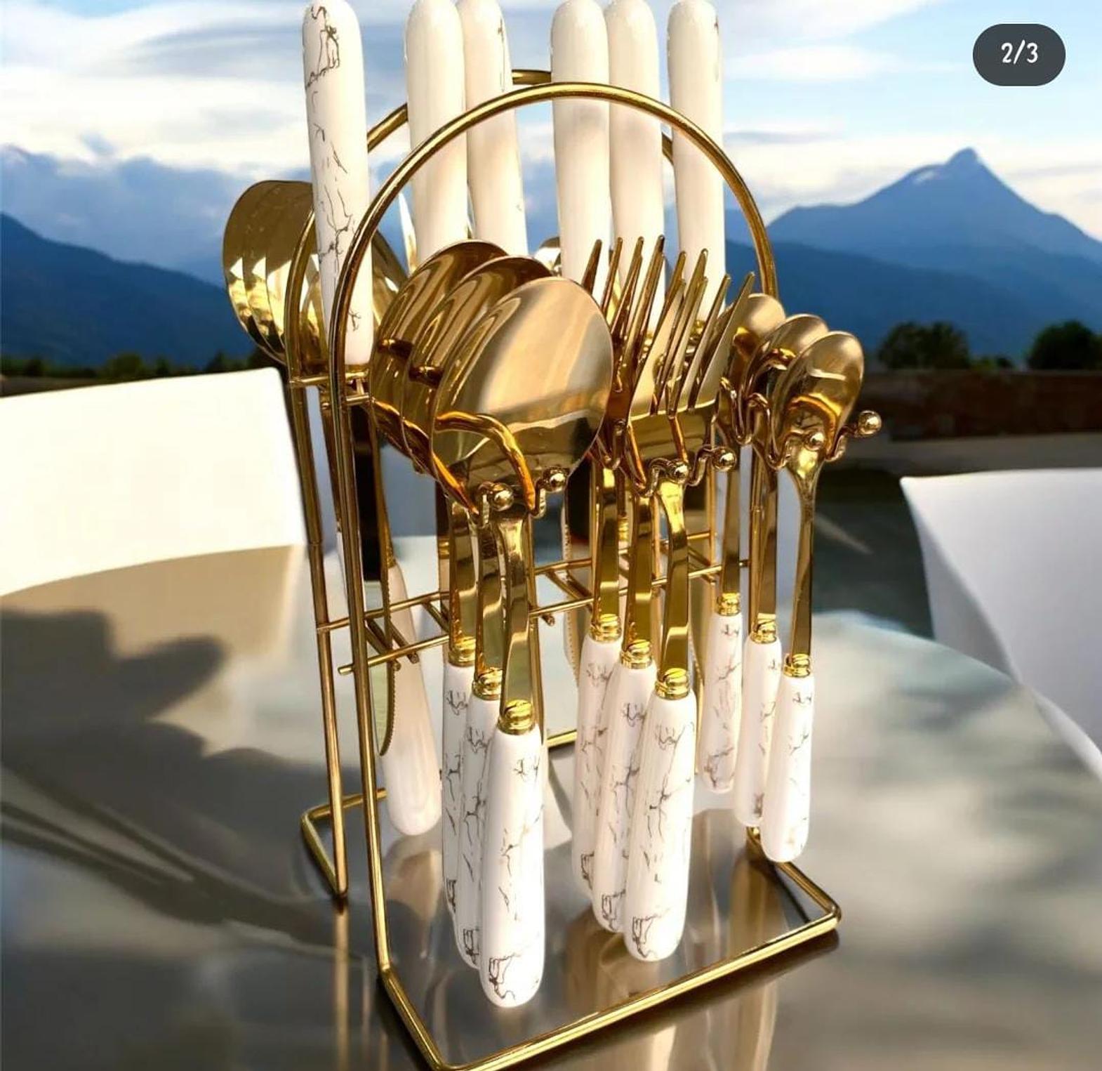 Enhance your table setting with this exquisite 24-piece marble cutlery set, a perfect blend of luxury and functionality. Featuring a stunning marble-inspired design, each piece is crafted from high-quality stainless steel for durability and long-lasting performance. The set includes knives, forks, spoons, and teaspoons, making it ideal for both everyday dining and special occasions. With a sleek, ergonomic design, these utensils offer a comfortable grip while adding a touch of modern elegance to your dining experience. Whether hosting guests or enjoying a family meal, this cutlery set brings effortless sophistication to any table.