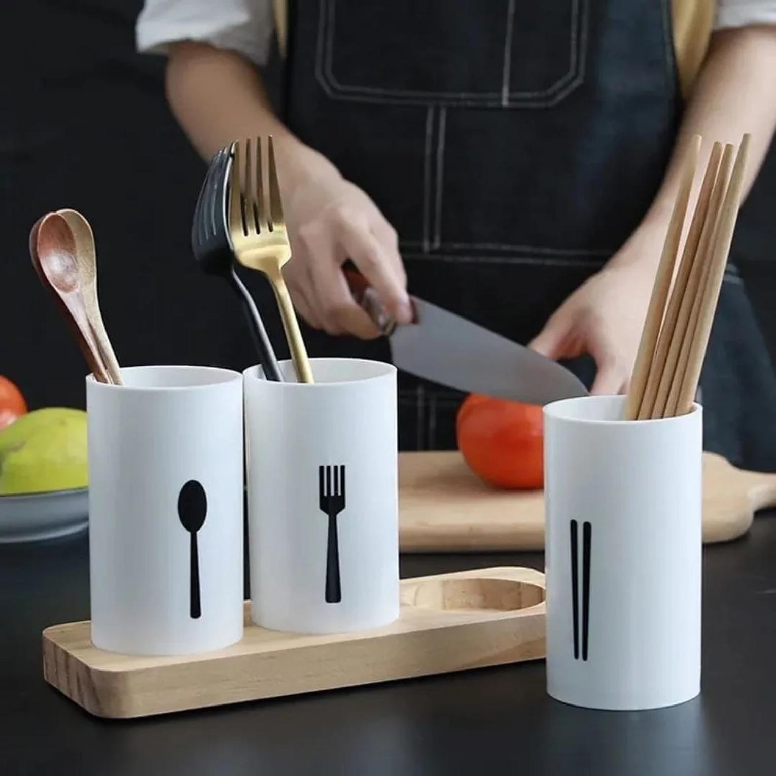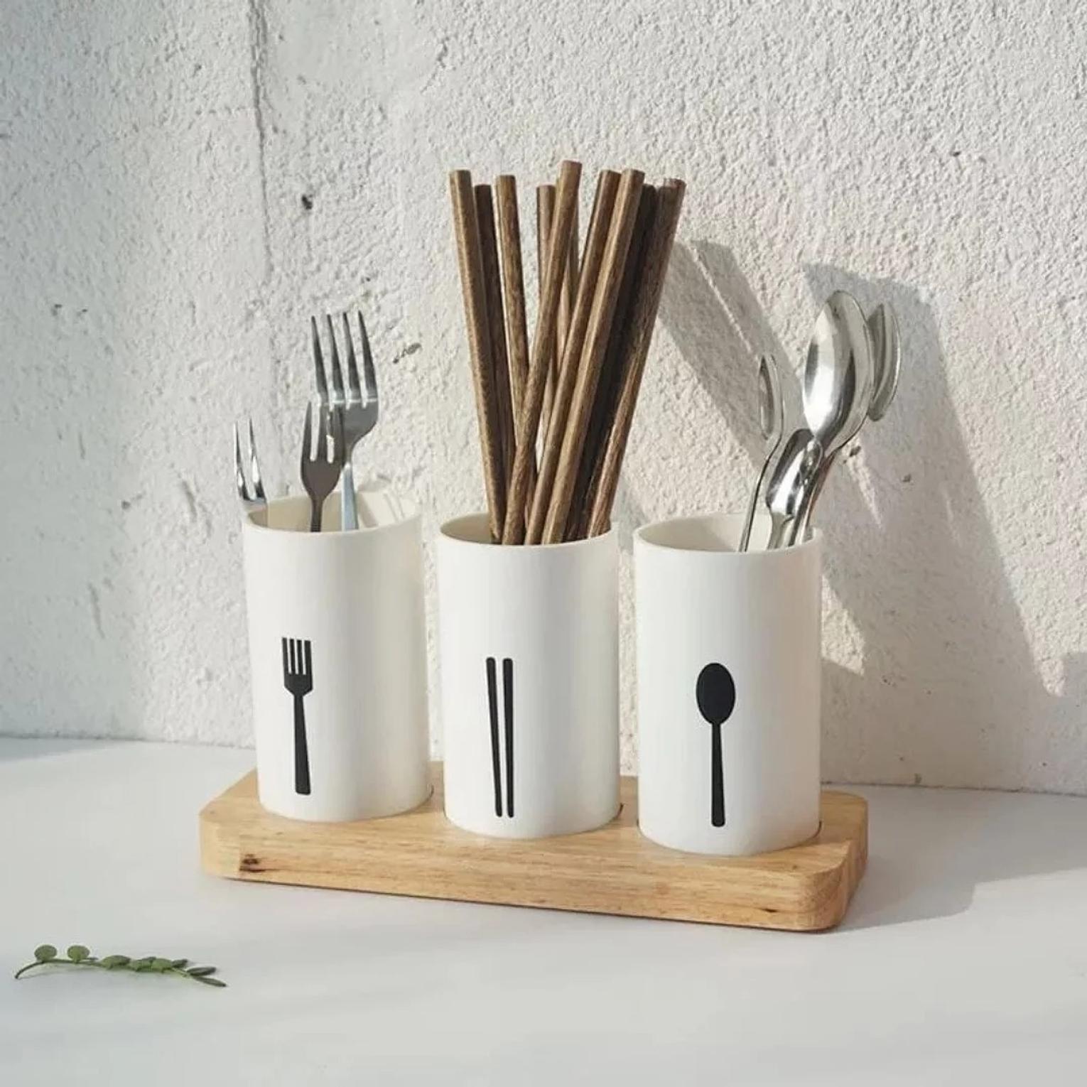 This sleek and practical 3-piece cutlery organizer is the perfect addition to any modern kitchen, offering an elegant solution for utensil storage. Each of the three pristine white cylinders is adorned with a distinct black silhouette – a fork, chopsticks, and a spoon – making organization effortless and visually appealing. Crafted for convenience, the organizer features outlet holes at the bottom of each cylinder to facilitate water drainage, ensuring your cutlery dries properly and preventing mildew. The set is securely housed on a solid oak wood base, providing stability and a touch of natural warmth to your countertop. Measuring at a compact 9.2 inches in length, 3.3 inches in width, and 5.1 inches in height, with each cylinder having a diameter of 2.5 inches, this organizer is designed to maximize space while keeping your most-used utensils within easy reach. Its thoughtful design allows for easy access and categorization of your cutlery, making meal prep and cleanup more efficient.