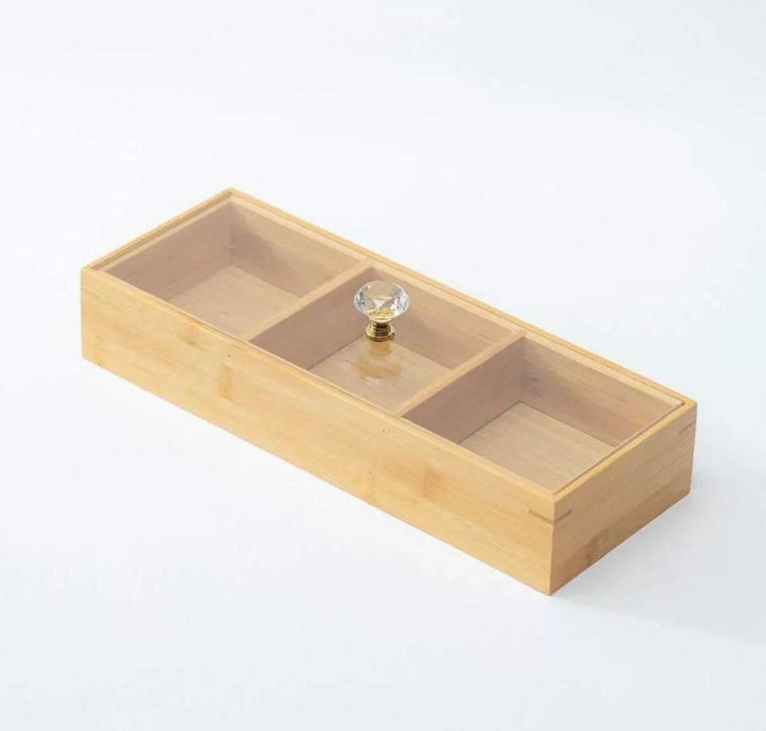 This 3-slot wooden tea bag and candy organizer brings both style and practicality to your kitchen or living area. Crafted from durable wood with a natural finish, it provides a sophisticated way to store and display your favorite tea bags, candies, or even small snacks. The divided compartments offer easy access and help keep your items neatly separated, ensuring that everything is within reach when you need it. Perfect for tea enthusiasts or anyone who loves to indulge in a sweet treat, this organizer doubles as a functional décor piece, enhancing your home with a rustic, yet refined charm. Whether placed on a countertop, in a pantry, or as part of a cozy tea corner, this piece keeps your essentials beautifully organized and easily accessible.