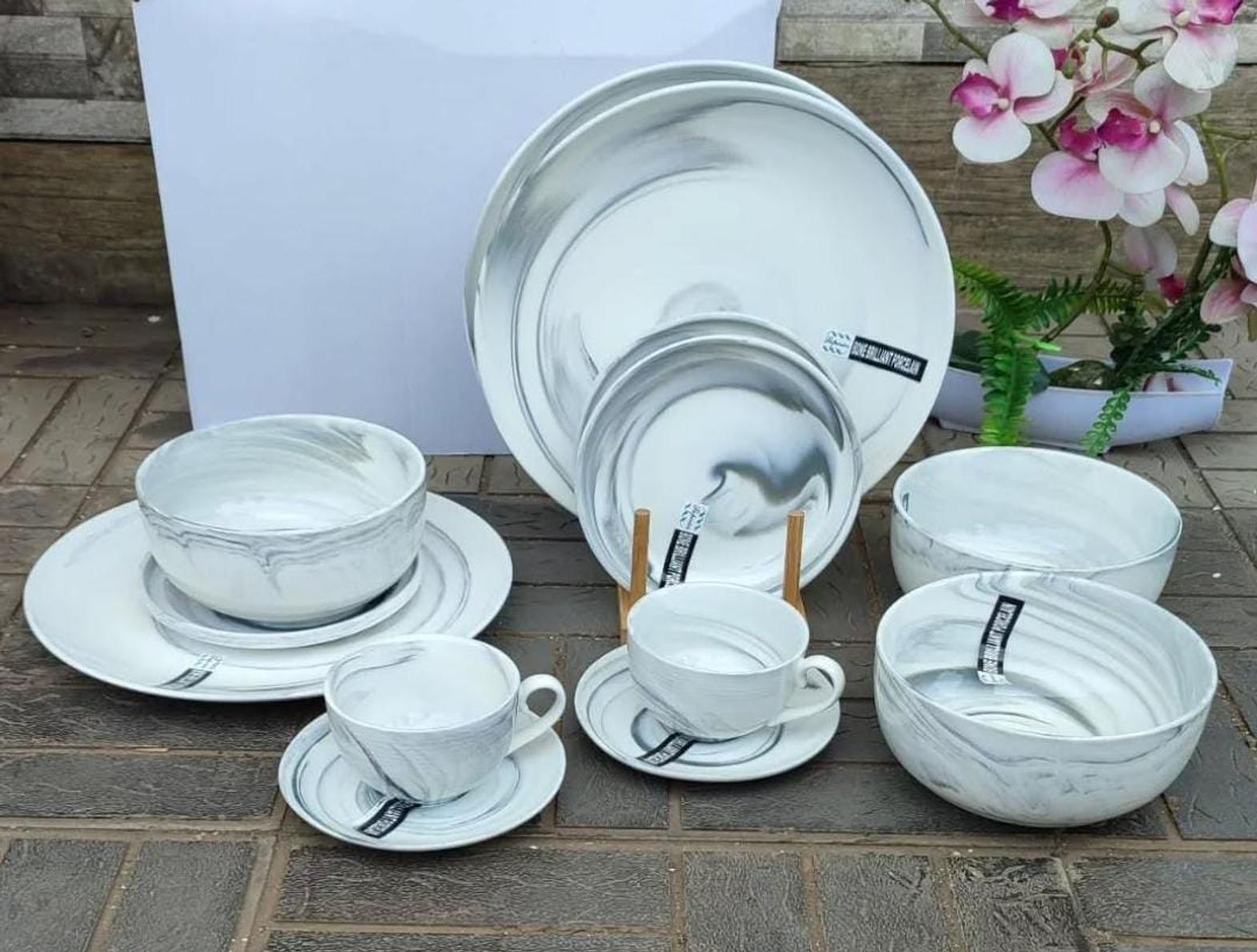 Set your table in style with our 36-piece Grey-Marble Nordic Classy Dinner Set, where sleek Nordic-inspired design meets timeless marble aesthetics. The soft grey tones and subtle marbling create a refined, modern look that enhances any dining occasion, from casual meals to formal gatherings. This set includes everything you need for a complete dining experience, including dinner plates, side plates, bowls, and cups, all crafted with high-quality porcelain for durability and long-lasting beauty. The elegant and versatile design easily complements various table settings, adding a touch of sophistication to your home while offering a functional and stylish dining solution.