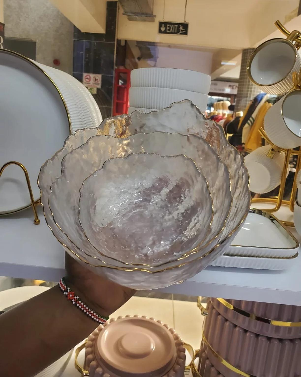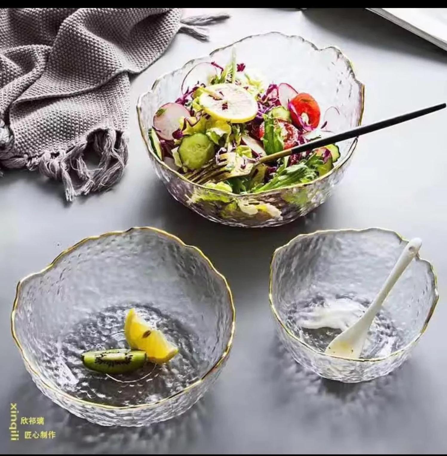 Enhance your table setting with the captivating beauty and practical design of the 3pcs Set Salad/Fruit Gold-Rimmed Serving Bowls. This versatile 3-piece set is an essential addition for any host or culinary enthusiast, designed to showcase your salads, fruits, and delectable desserts in stunning style. Each bowl is crafted from high-quality, clear glass, featuring a distinctive hammered texture that creates a mesmerizing play of light and shadow, adding depth and character to your presentation. The irregular, organic rim of each bowl is delicately finished with an elegant gold accent, providing a luxurious touch that beautifully complements any décor. The set includes three convenient capacities: a spacious 1050ml bowl ideal for large salads or fruit platters, a versatile 700ml bowl perfect for side dishes or individual servings, and a charming 300ml bowl suitable for nuts, dips, or small desserts. These bowls are great for serving at dinner parties, family gatherings, or for adding a touch of everyday luxury to your meals. Their durable construction ensures long-lasting use, while their exquisite design makes them a truly eye-catching centerpiece.