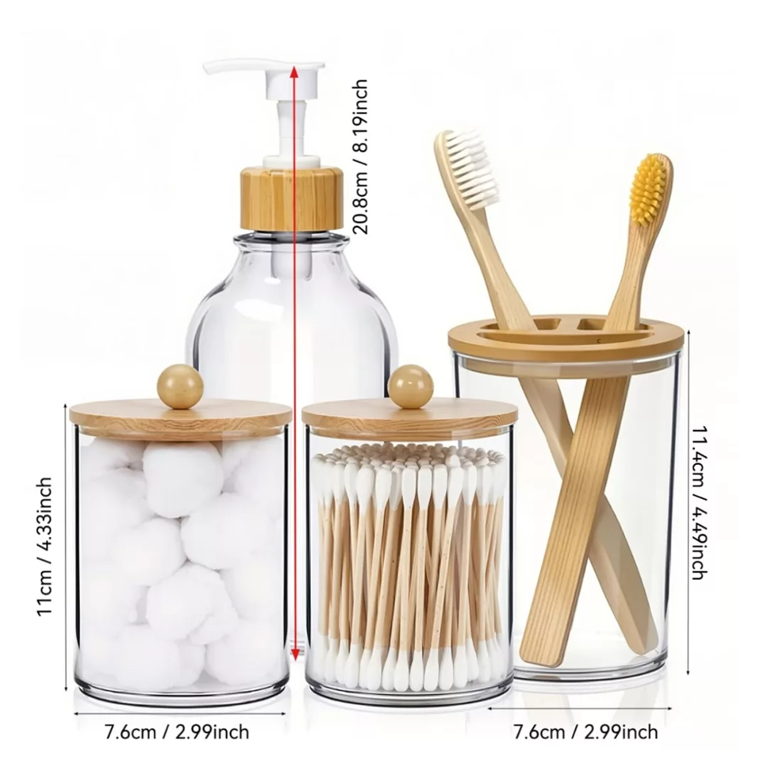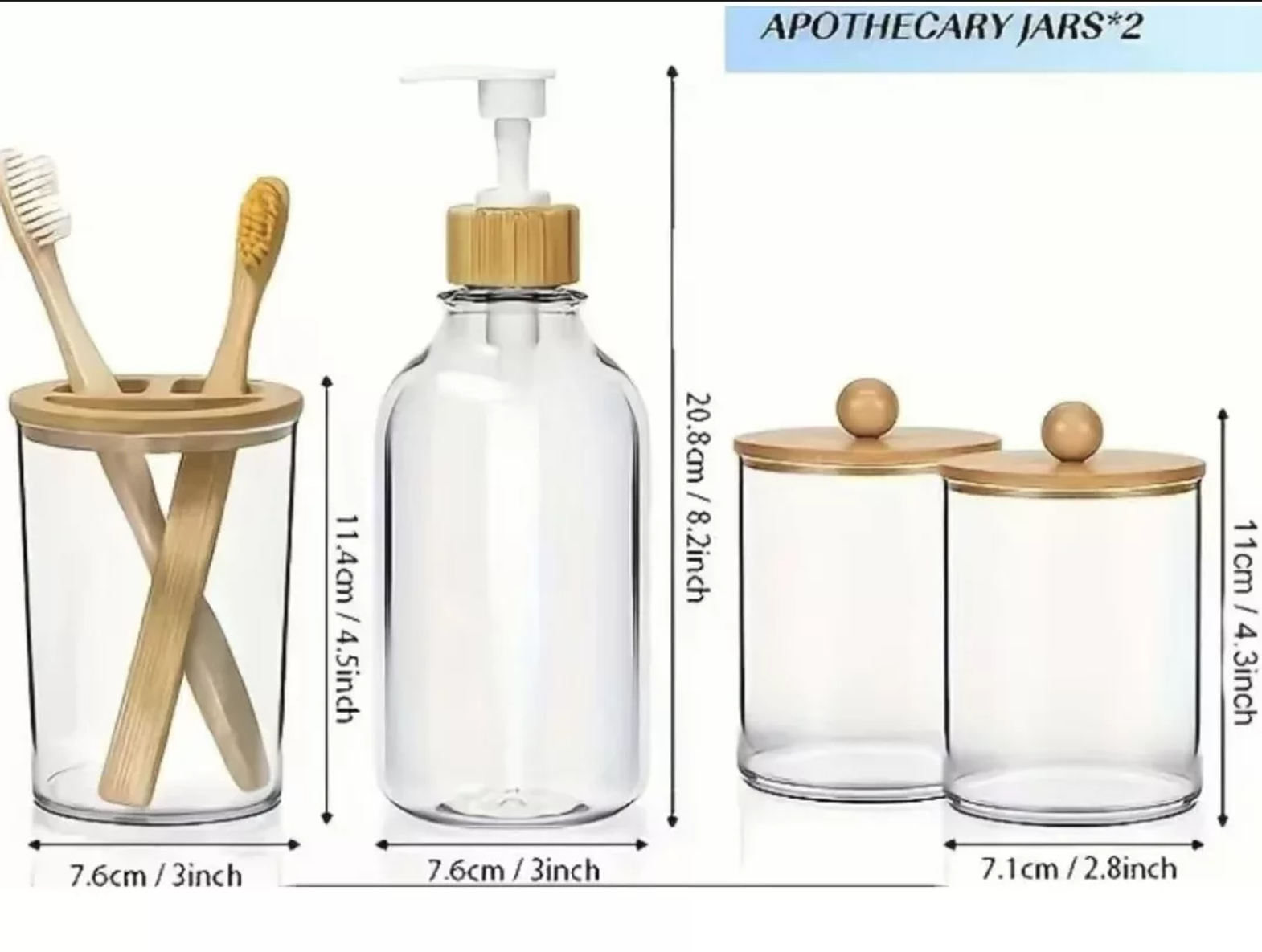 Transform your bathroom into a cozy, organized space with this 4-piece bamboo bathroom accessories set, designed in a rustic boho style to complement modern and natural interiors. The set includes a soap dispenser, toothbrush holder, and two cotton swab holder jars, offering both style and practicality. Made from a blend of PET and durable plastic, these accessories are lightweight, easy to clean, and long-lasting. Perfect for adding a warm, earthy touch to your bathroom décor, this set combines everyday convenience with eco-inspired elegance.