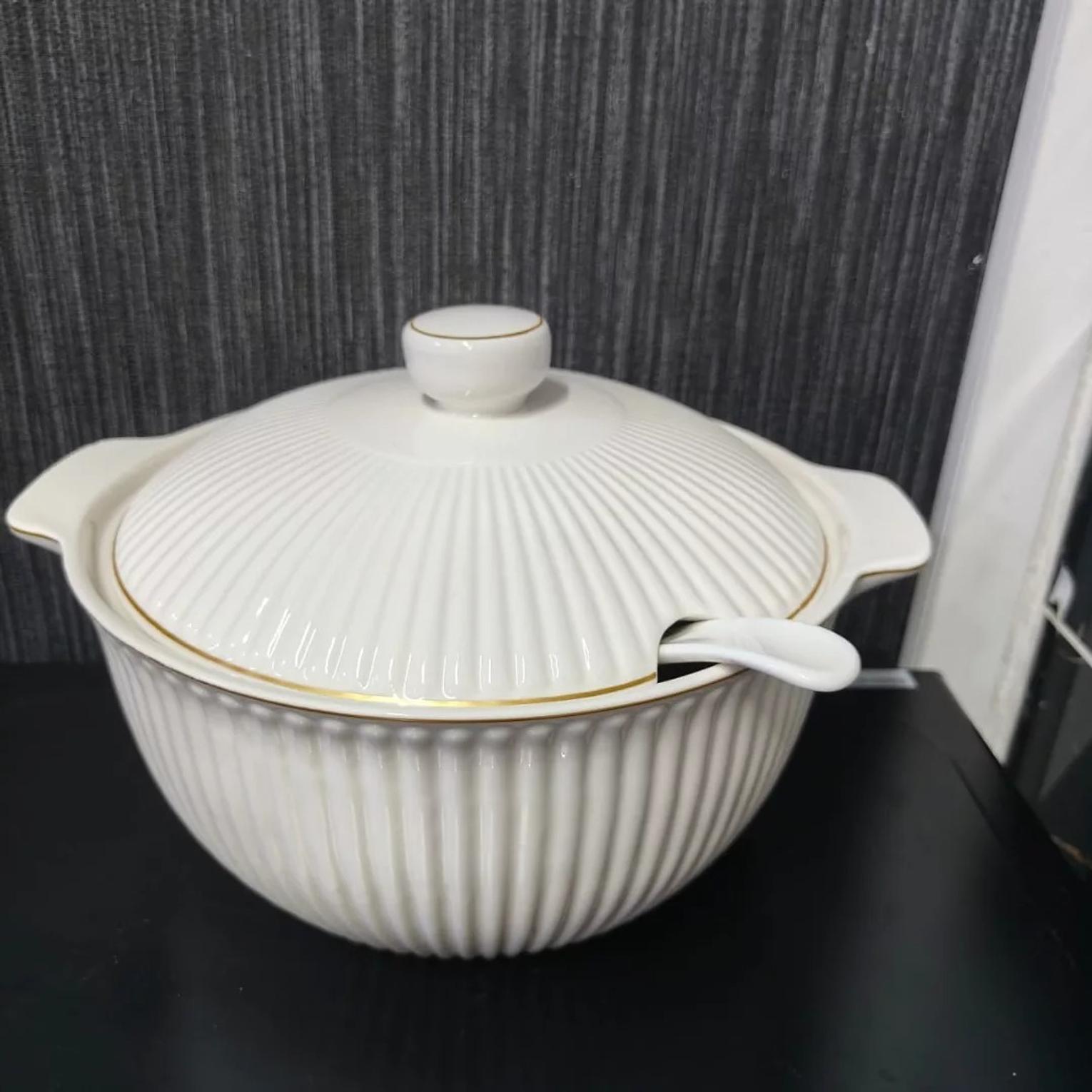 Present your culinary creations with elegance using our Elegant Fluted Ceramic Serving Dish with Lid & Spoon. This beautifully crafted dish is designed for both functionality and aesthetic appeal, making it an ideal centerpiece for family meals, dinner parties, or special occasions. With a generous 4-liter capacity, it's perfect for serving soups, stews, casseroles, salads, or any large-batch dish.