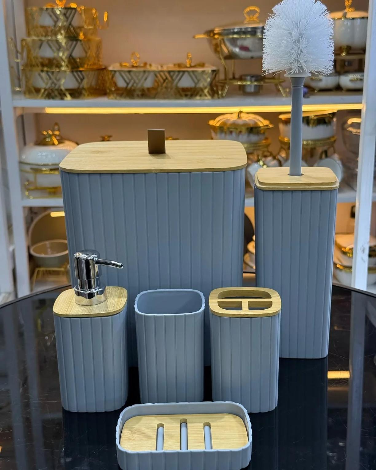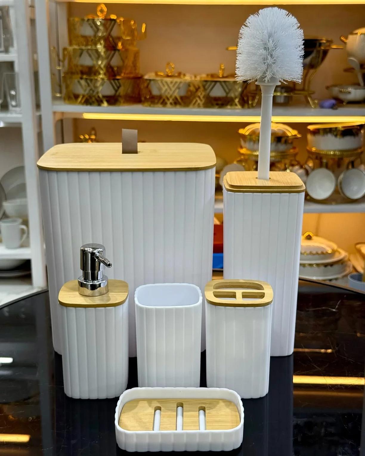 Transform your bathroom into a more organized and aesthetically pleasing space with this contemporary 6-in-1 Bathroom Accessory Set. This comprehensive collection includes all the essentials you need: a convenient trash can, a discreet toilet brush with its holder, a functional lotion dispenser, a practical toothbrush holder, a versatile toothbrush cup, and a tidy soap dish. Each piece is designed with a sleek, clean finish, complemented by elegant bamboo wooden tops that add a touch of natural warmth and sophistication. The thoughtful design ensures both durability and ease of use. Available in classic black, crisp white, and modern grey, this set allows you to easily match your existing bathroom decor. It's the perfect way to unify your bathroom's style while keeping everything neatly arranged and readily accessible.