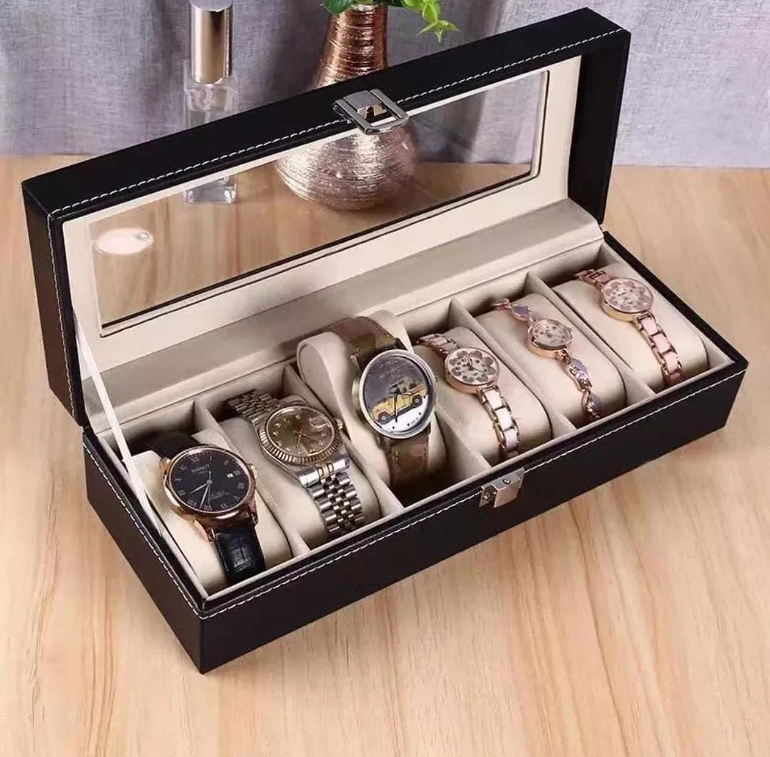 Keep your watch collection safe, organized, and elegantly displayed with this 6 Slots Watch Organizer/Storage Box. Crafted with a sturdy exterior and a soft, cushioned interior, each slot is designed to cradle your watches, protecting them from dust, scratches, and damage. The transparent lid offers a clear view of your collection, making it easy to pick the perfect watch for any occasion while adding a touch of sophistication to your dresser or shelf. Whether you're a seasoned collector or just starting out, this storage box is a must-have for anyone who values both style and functionality. Perfect for personal use or as a thoughtful gift for watch lovers.
