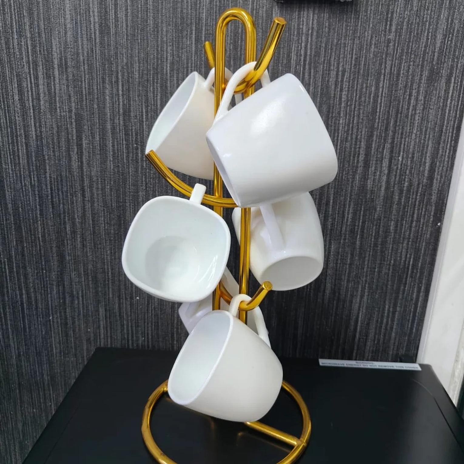 Transform your beverage service with our Elegant 6-Piece Ceramic Mug Set with Gold Display Stand. This stunning collection includes six pristine white ceramic mugs, each designed with a comfortable handle and a classic, clean aesthetic that complements any kitchen or dining decor. These high-quality ceramic mugs are perfect for enjoying your morning coffee, afternoon tea, hot chocolate, or any favorite beverage.