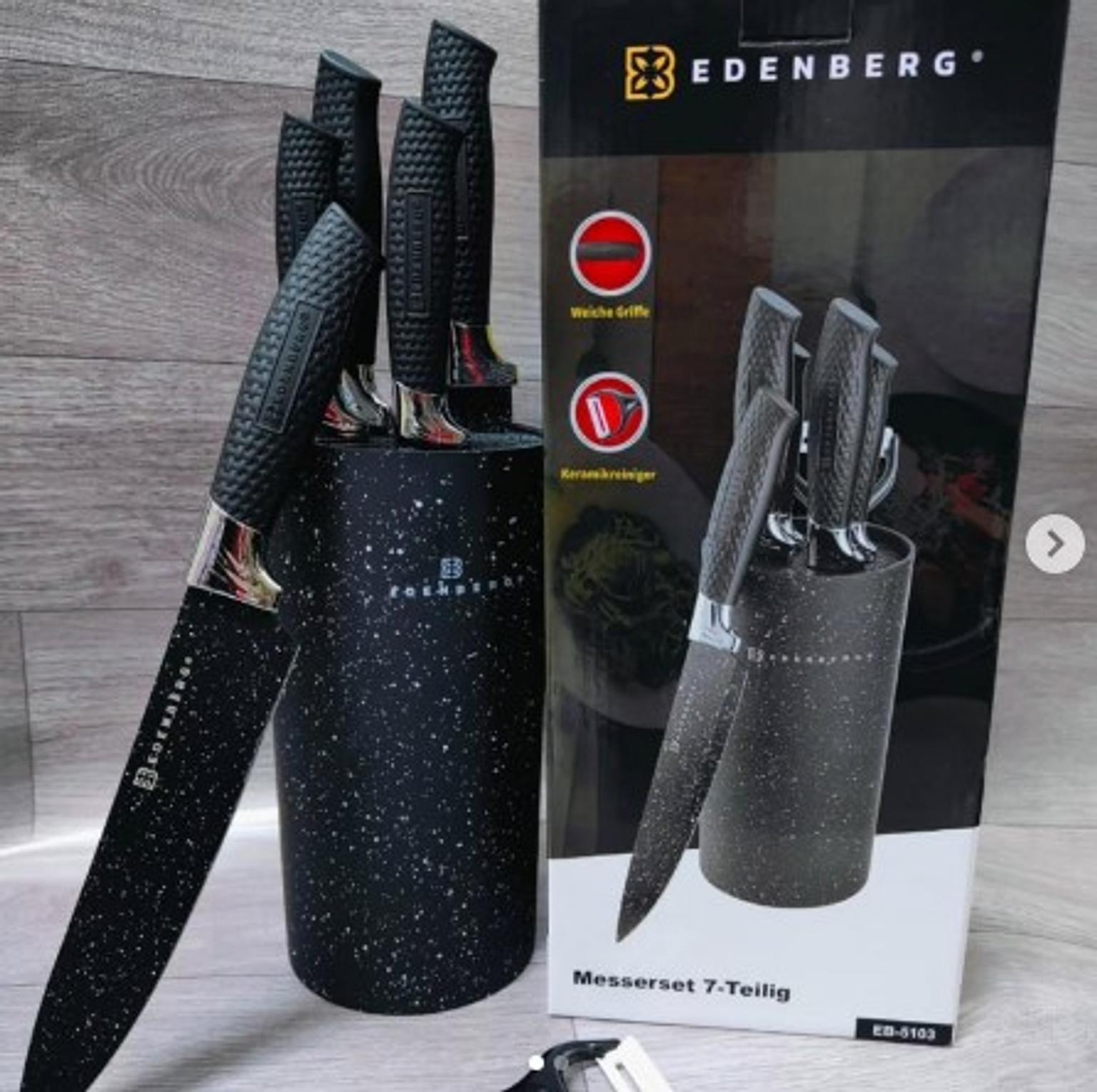 The 7-piece Edenberg knife set redefines kitchen excellence with its unmatched quality and elegant craftsmanship. Each knife is meticulously forged from high-grade stainless steel, ensuring long-lasting sharpness, resistance to corrosion, and exceptional performance for all your cutting, slicing, and dicing needs. The ergonomic handles provide a comfortable, secure grip, making meal preparation effortless and enjoyable. With its sleek design and versatile functionality, this set is a perfect addition to both modern and traditional kitchens. Packaged with a stylish knife holder for organized storage, the Edenberg set is ideal for professional chefs and home cooks seeking precision and reliability.