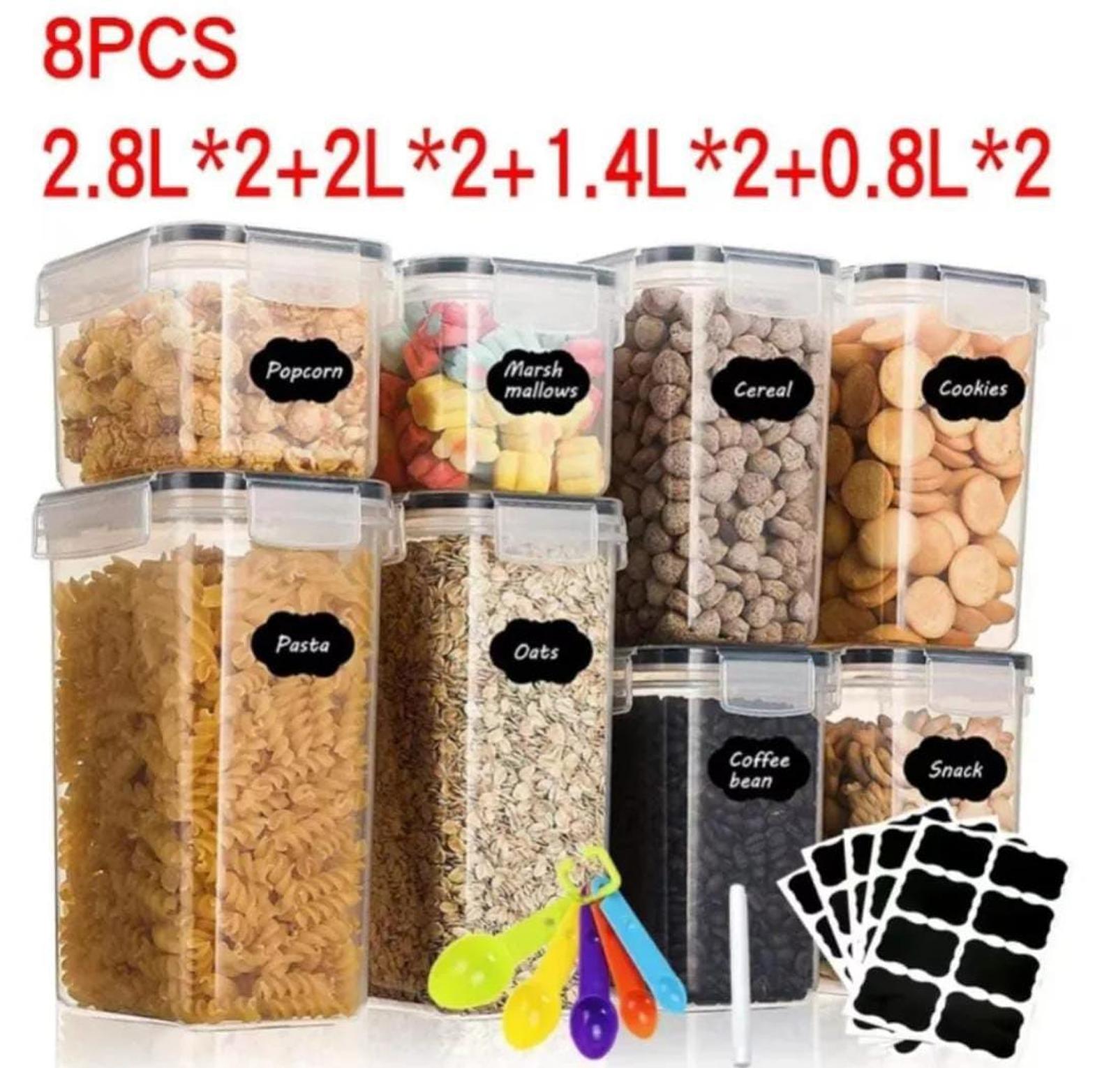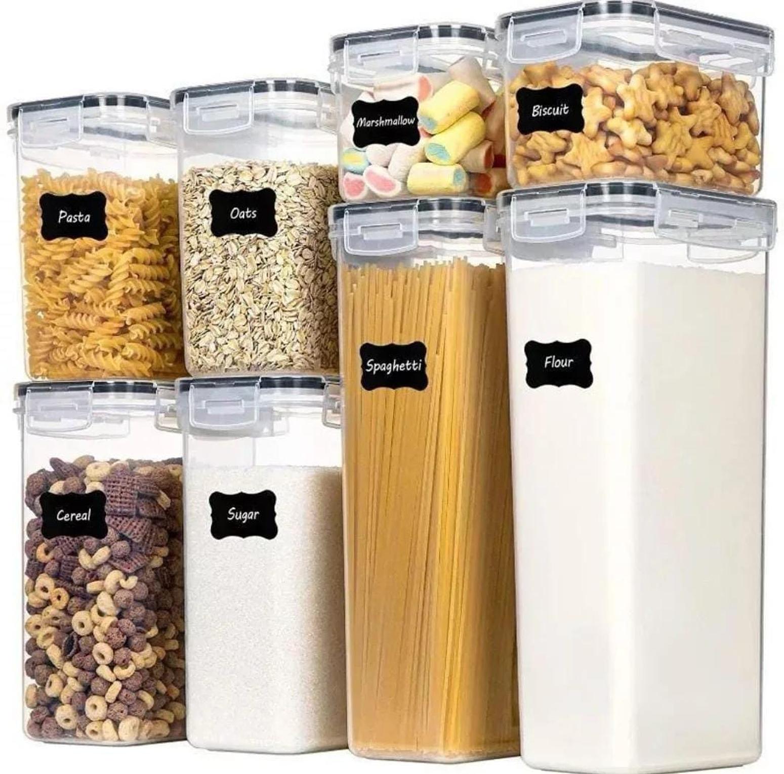 Keep your kitchen effortlessly organized with this 8 pcs Food/Pantry Storage Container Set, designed to bring both order and elegance to your pantry. Made from durable, BPA-free plastic with airtight lids, these containers help preserve the freshness of dry goods like grains, pasta, flour, snacks, and cereals. The clear, stackable design allows for easy visibility and space-saving storage, making it simple to find what you need at a glance. Ideal for busy households or anyone looking to maintain a clutter-free kitchen, this set not only boosts functionality but also adds a clean, modern look to your shelves. Whether you're meal prepping, bulk-storing, or just keeping things tidy, these containers are a must-have kitchen essential.