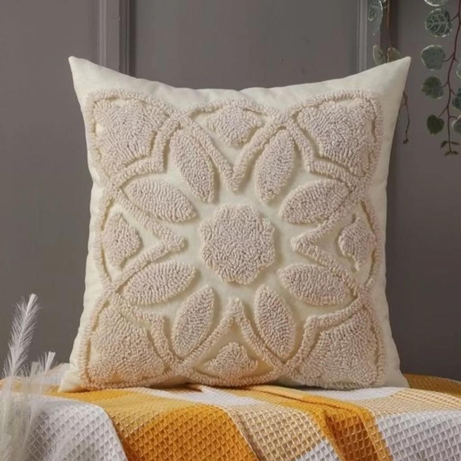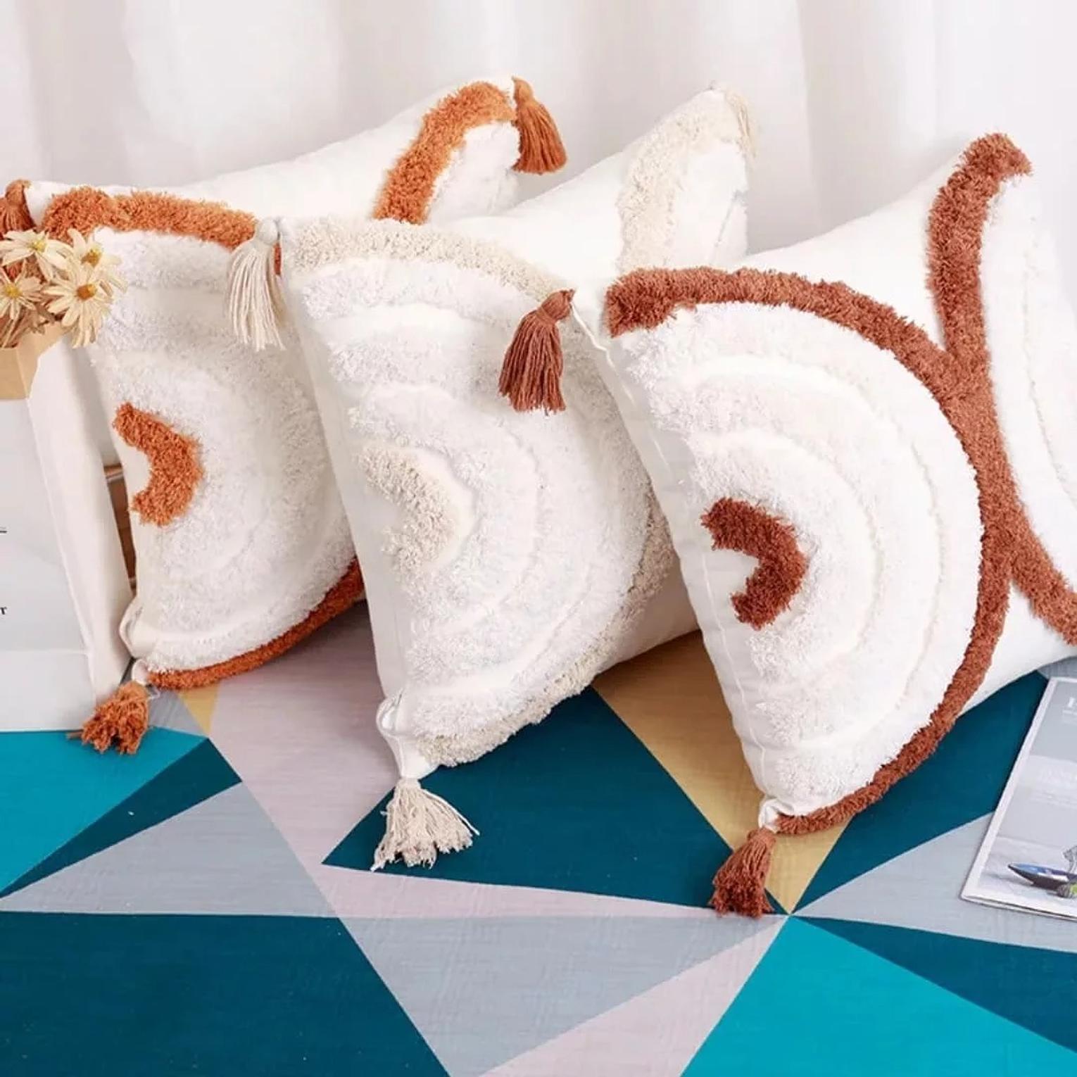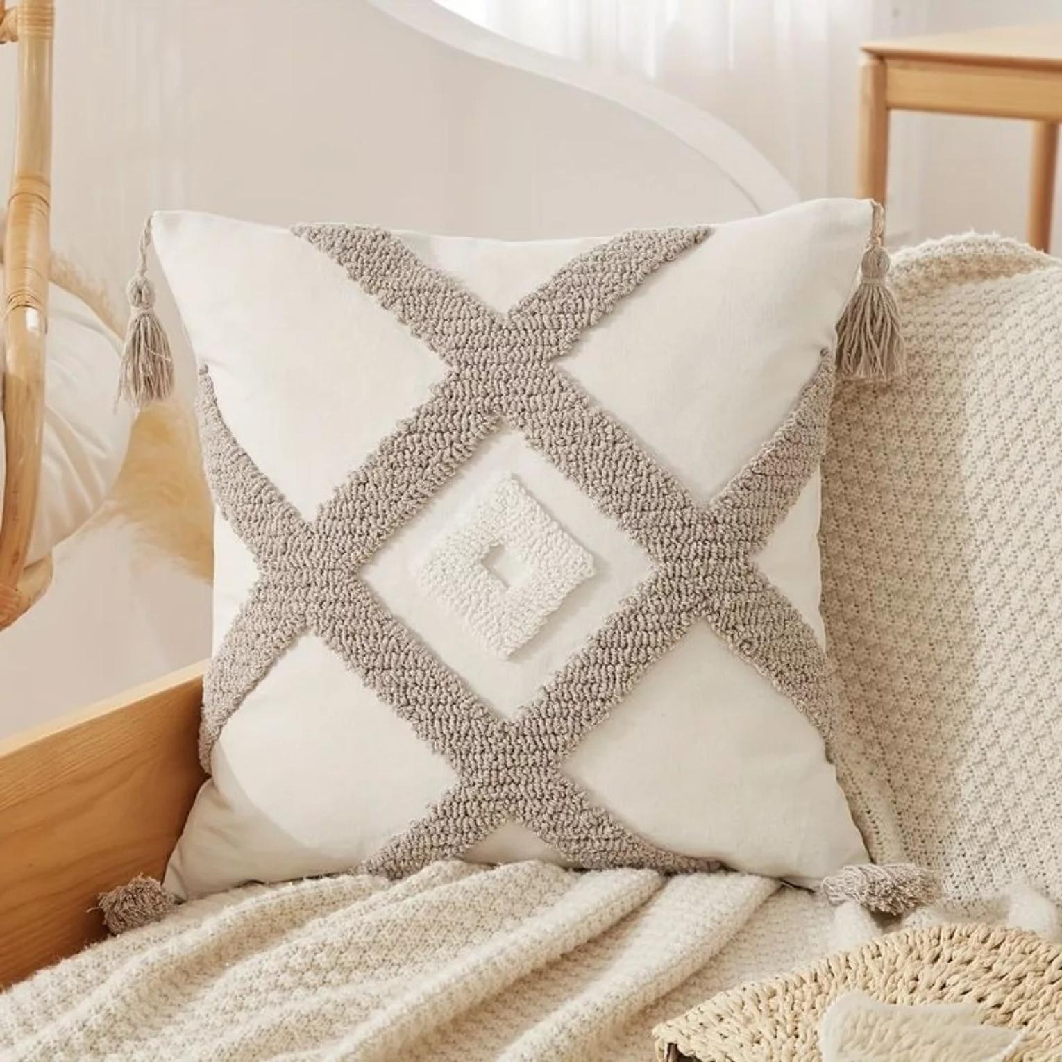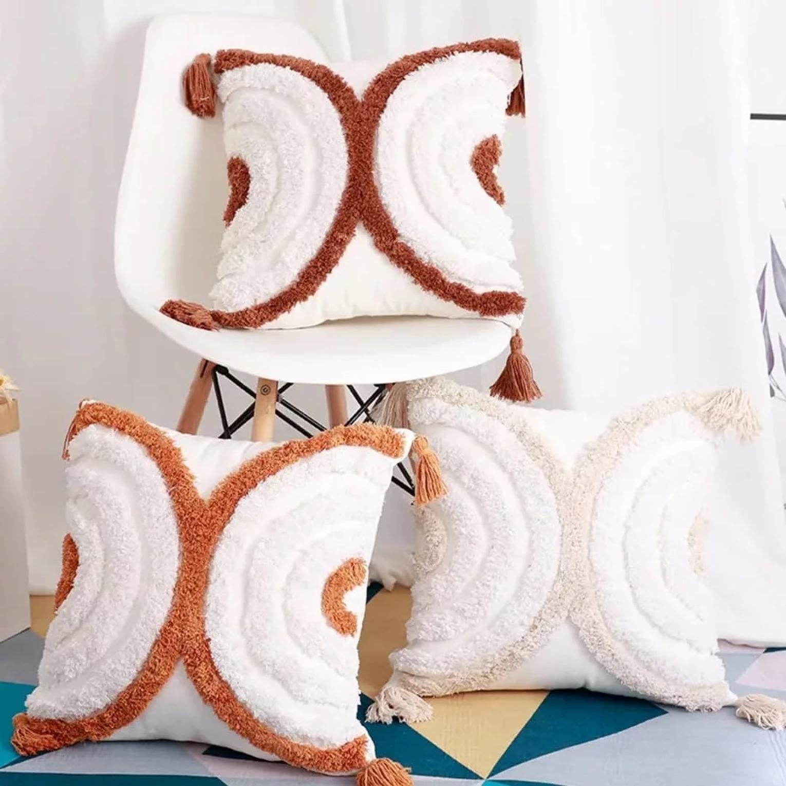 Elevate your home decor with the captivating Boho Bloom Tufted Tassel Throw Pillow Cover, designed to bring a relaxed, artistic vibe to your living space. Measuring a versatile 45 x 45 cm (18 x 18 inches), this pillow cover is the ideal size for sofas, chairs, beds, or accentuating any cozy corner. Crafted with a delightful tufted pattern, it offers a rich, tactile texture that invites comfort and visual interest. The distinctive boho-inspired design is beautifully accented with charming tassels on each corner, adding a playful and authentic bohemian touch. Made from high-quality, durable fabric, the BohoBloom cover is soft to the touch and built to withstand everyday use, ensuring long-lasting beauty. Its neutral yet expressive color palette (as seen in the image, featuring white with earthy accents) makes it easy to integrate into various interior styles, from eclectic bohemian to modern farmhouse. Instantly refresh your living room or bedroom with this stylish and comfortable accent piece. This pillow cover is a must-have for those seeking boho throw pillows, textured cushion covers, tassel pillow designs, square decorative pillows, and bohemian home decor accents.