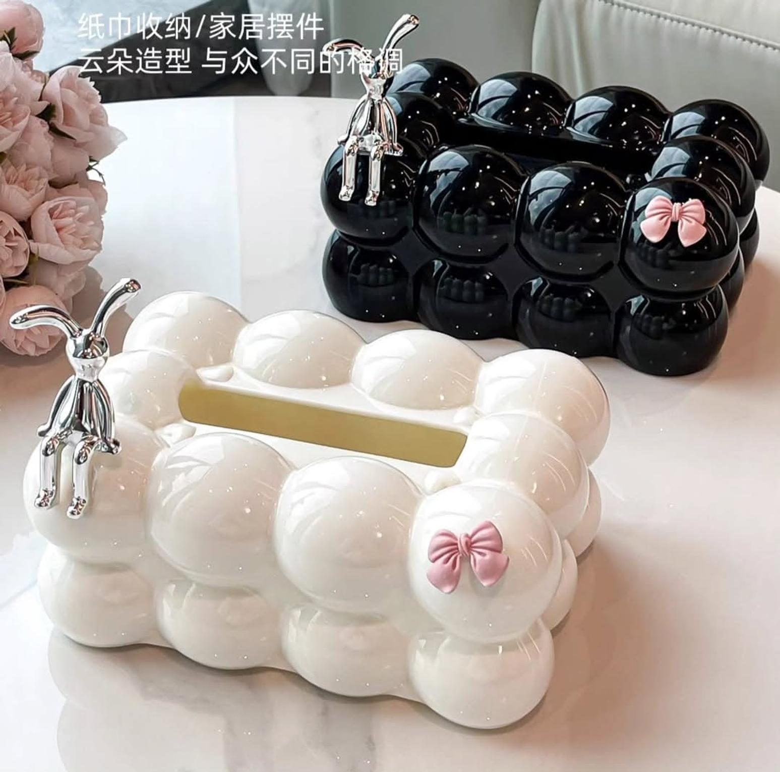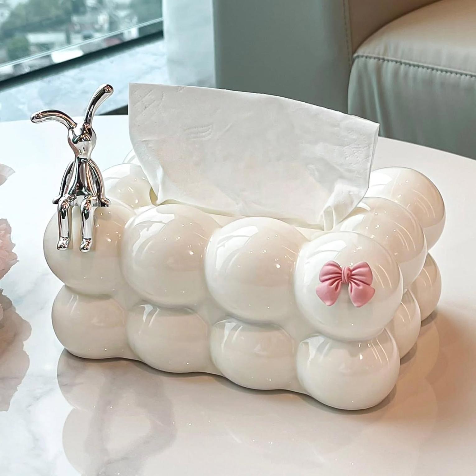 Elevate your space with the bubble tissue box/serviette holder, a decorative yet functional accent designed to blend seamlessly with modern interiors. Featuring a playful bow and bunny figurine detail, this holder adds a touch of charm while keeping tissues neatly stored and easily accessible. Available in classic white and black, it’s versatile enough for living rooms, bedrooms, offices, or bathrooms, offering both practicality and style. Durable, elegant, and easy to use, this tissue box cover is the perfect accessory to complement any décor.