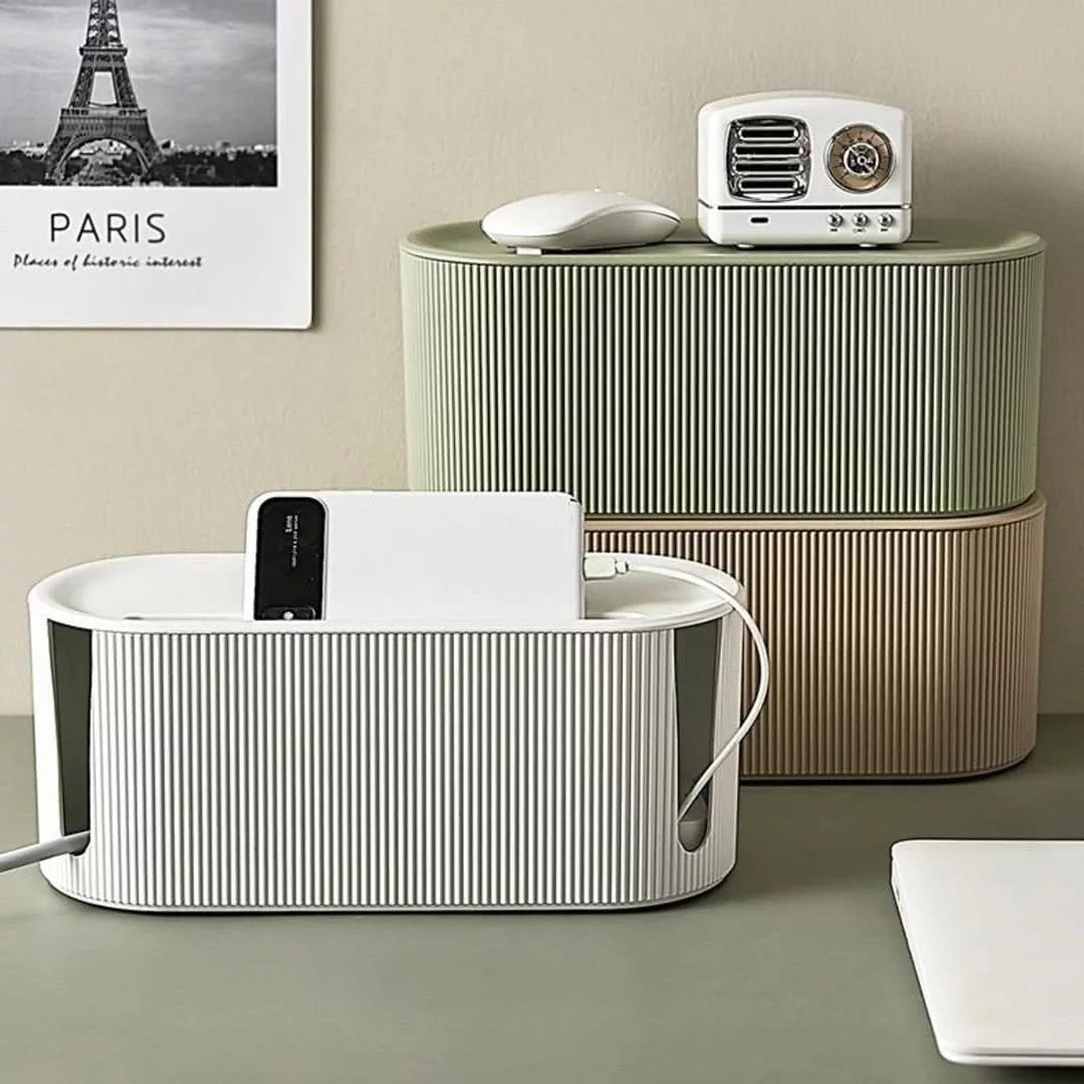 Achieve a clean and organized aesthetic in your home or office with this Modern Cable Management & Storage Box. This essential organizer is expertly designed to effectively conceal power strips, adapters, and excess cables, transforming messy tangles into a neat and streamlined setup. By enclosing your cords, it not only reduces visual clutter but also prevents dust accumulation and enhances safety by minimizing tripping hazards, especially important in homes with children or pets. The box features convenient openings on the sides to allow cables to enter and exit smoothly, while the top surface provides a stable platform for charging devices or placing small items. Perfect for use under desks, next to entertainment centers, or on bedside tables, this cable storage box is a practical and stylish solution to keep your cables well-organized and maintain a polished look in any room.
