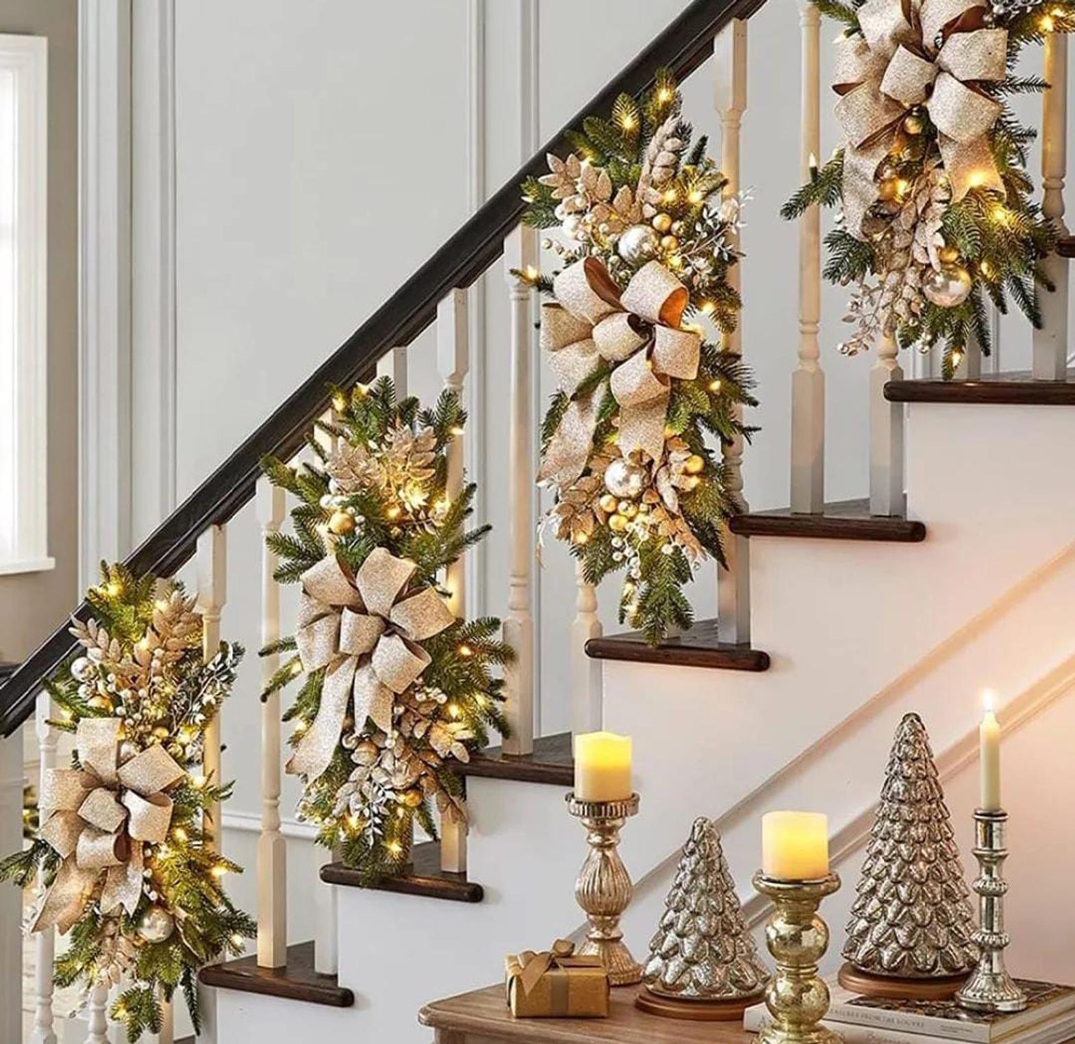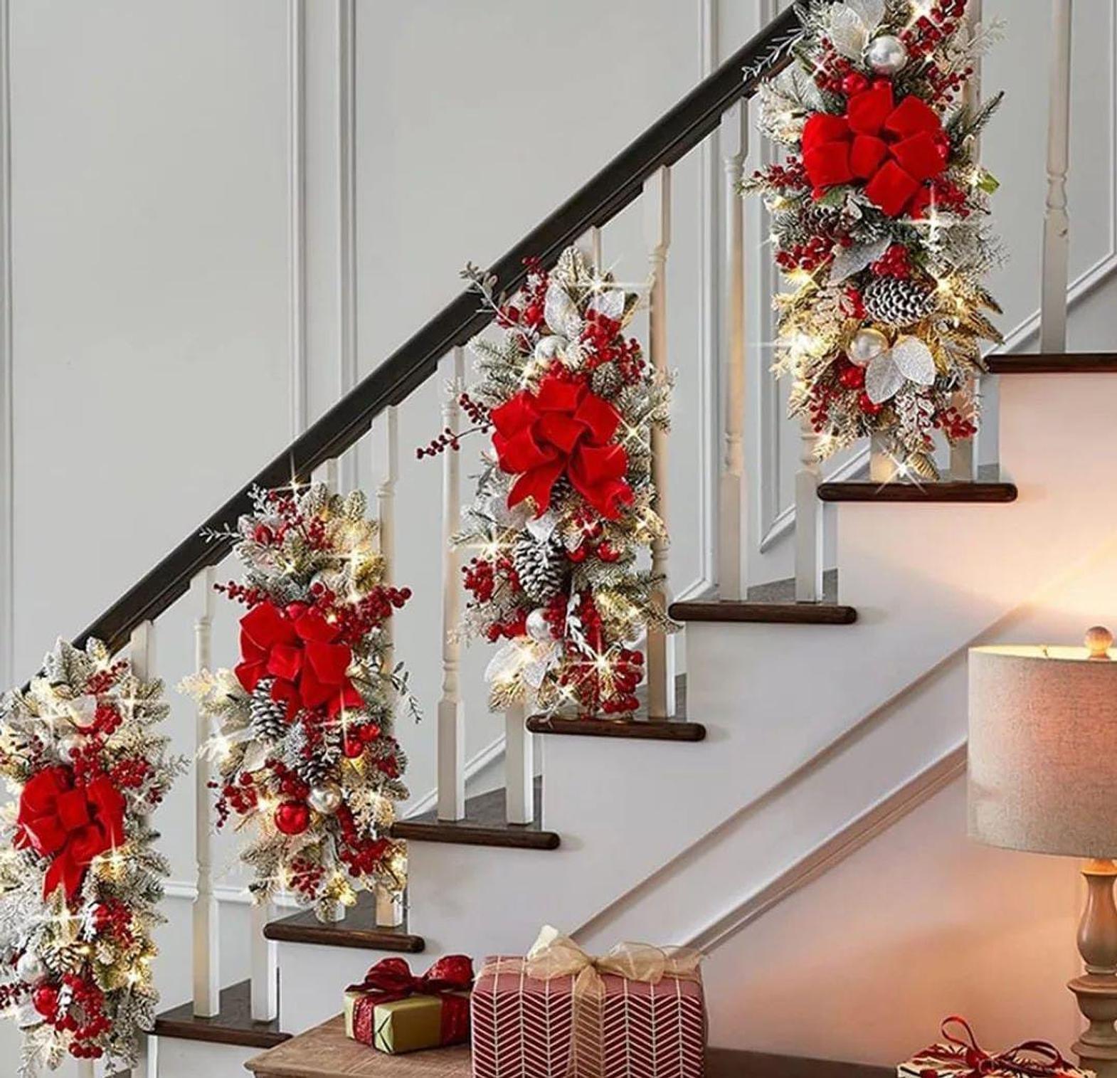 Our Christmas swag wreath pendants bring festive elegance to your home, designed with LED lights that add a warm, glowing ambiance to your decorations. The beautiful swag features rich greenery, festive ribbons, and decorative trims, creating a welcoming and joyful atmosphere for your staircase, doors, windows, or any space that needs a holiday touch. The built-in LED lights illuminate the wreath, creating a soft, twinkling effect that adds depth and sparkle to your decor. Whether used indoors or outdoors, this versatile ornament can be easily hung and styled to suit your Christmas theme, making it a perfect addition to your seasonal decorations.