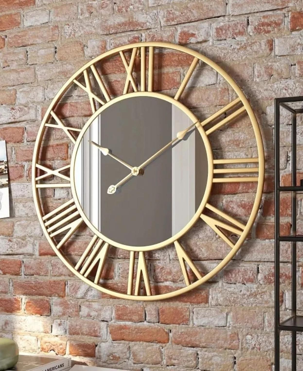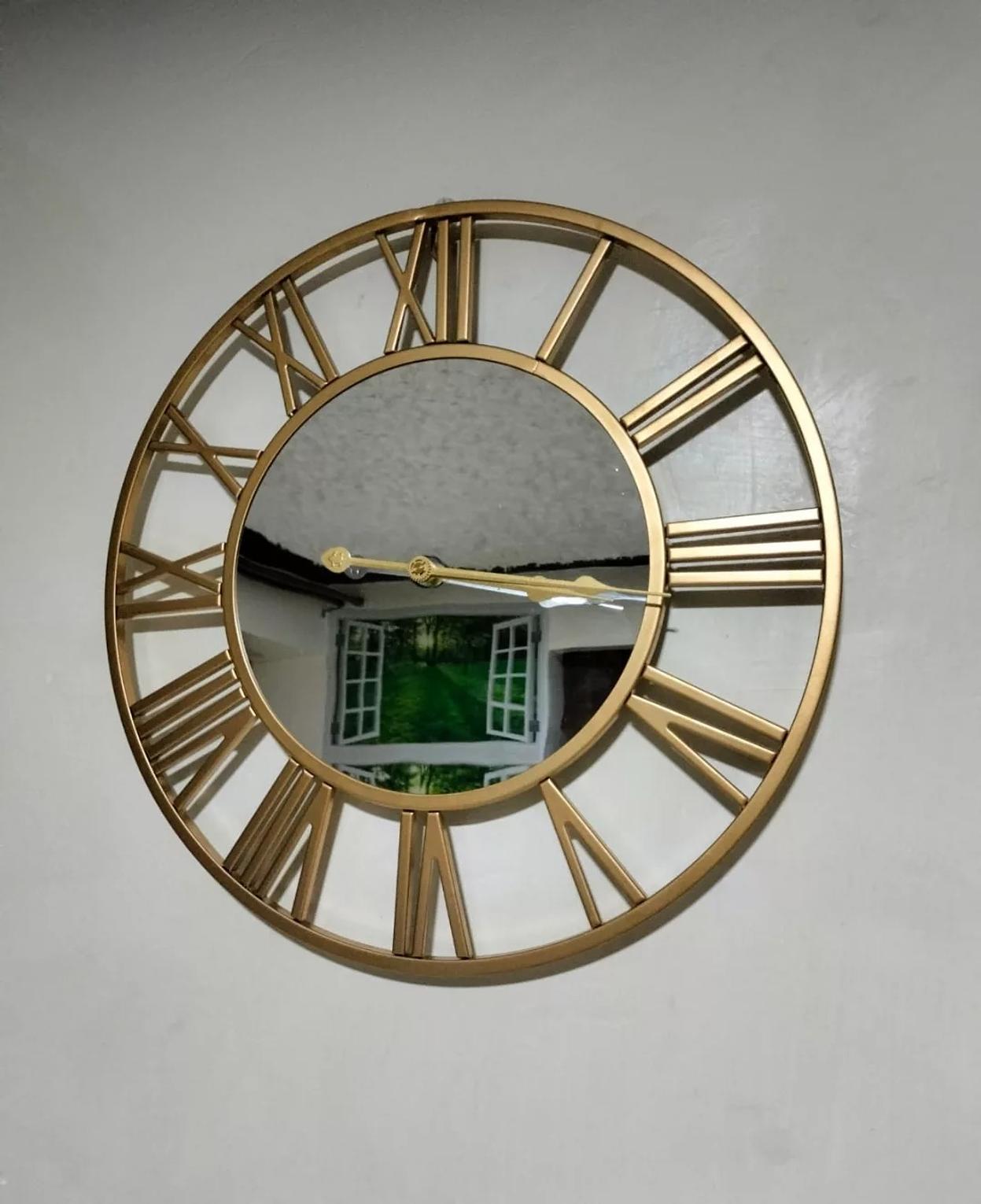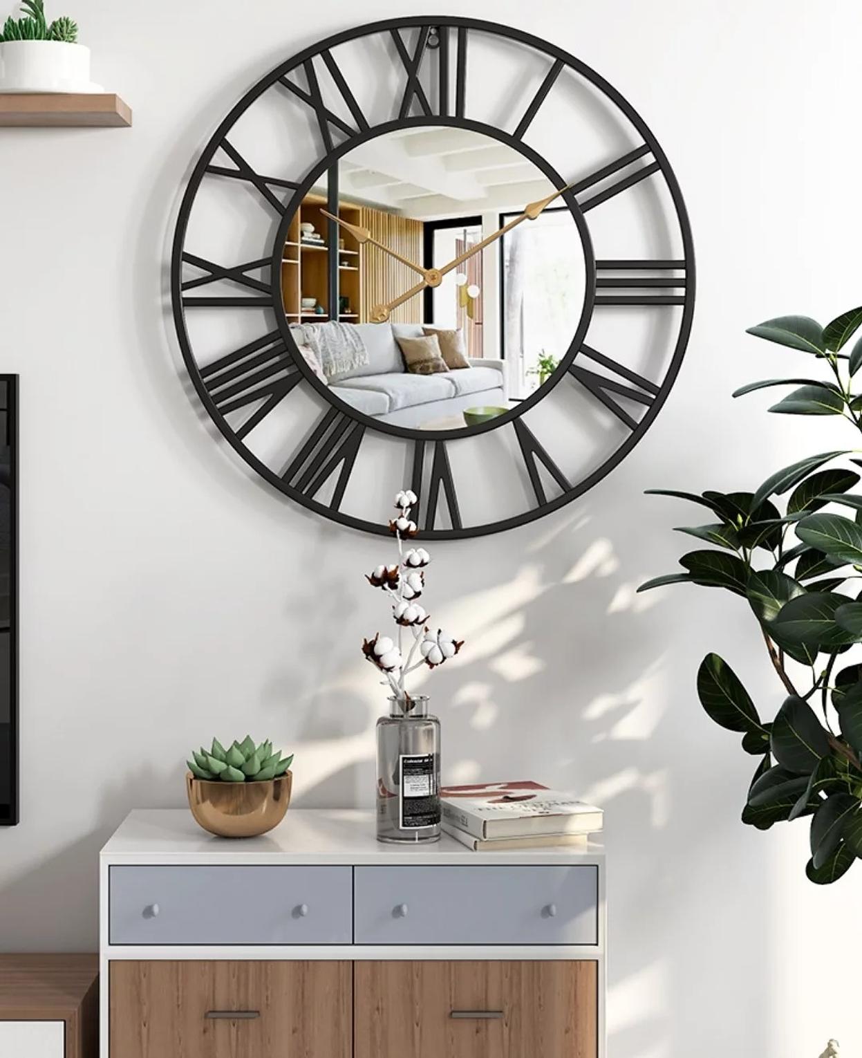 Elevate your living space with the exquisite Regal Roman Metal Mirror Clock, a stunning fusion of modern design and timeless elegance. This large wall clock, boasting a 50cm diameter, is meticulously crafted from durable wrought iron with a sleek black finish, creating a bold and sophisticated statement piece. The central round mirror face not only adds a touch of luxury but also enhances the sense of space and light in any room. Around its circumference, beautifully rendered Roman numerals provide a classic and distinguished look, ensuring easy readability while contributing to its European-inspired charm. Designed with a silent sweeping movement, this clock offers precise timekeeping without any distracting ticking sounds, maintaining a peaceful atmosphere in your home. Perfect for a living room, dining area, or grand entryway, the Regal Roman clock serves as both a functional timepiece and a captivating piece of wall art, seamlessly blending with contemporary, industrial, or classic interior styles. This decorative mirror clock is a must-have for those seeking large wall clocks, metal wall decor, silent clocks, Roman numeral clocks, and luxury living room accents.