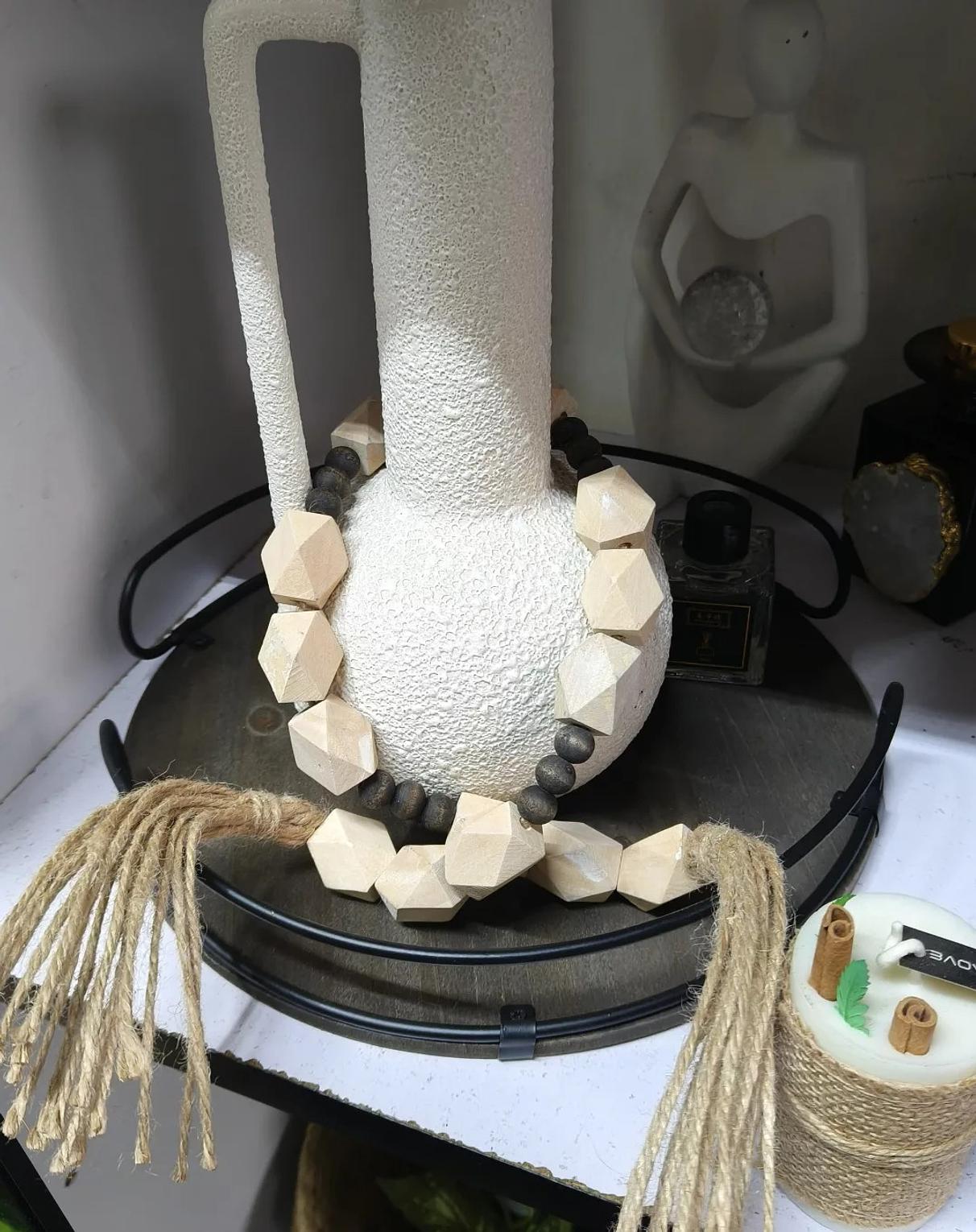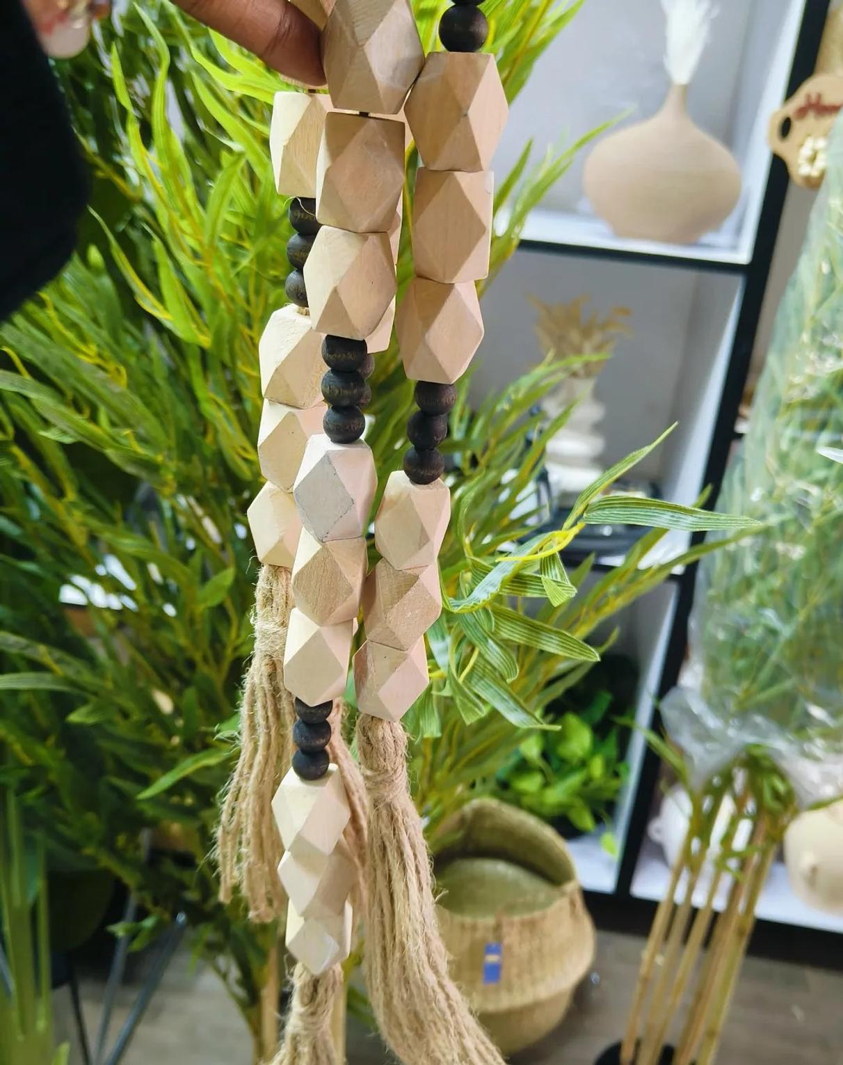 Elevate your home's aesthetic with the Geometric Harmony Wood Bead Garland, a versatile and stylish decorative accent. This exquisite garland is thoughtfully designed with a series of geometric faceted wooden beads that offer a contemporary twist on classic farmhouse and bohemian styles. Interspersed with smaller, contrasting dark beads, the garland creates a striking visual rhythm. Each end is adorned with rustic jute tassels, adding an extra layer of organic texture and charm. Ideal for draping over books, coiling in a decorative bowl, accentuating a mantelpiece, or adding a warm touch to shelves and side tables, this garland is perfect for creating a cozy and inviting atmosphere. Its natural wood tones and minimalist design ensure it complements a wide range of interior styles, from modern and Scandinavian to rustic and eclectic. This decorative piece is a must-have for those seeking wood bead decor, bohemian garlands, farmhouse accents, natural home accessories, and unique decorative strings.