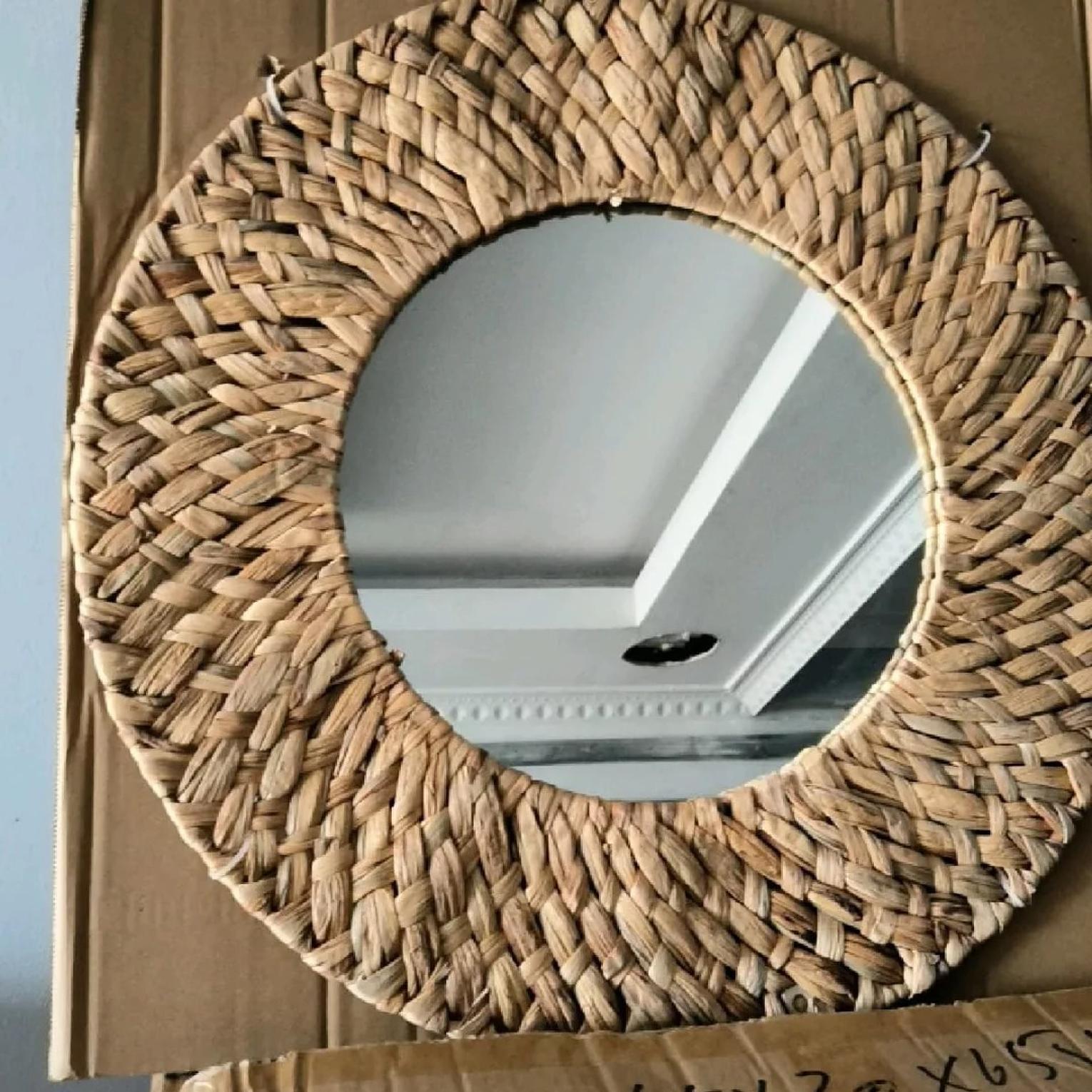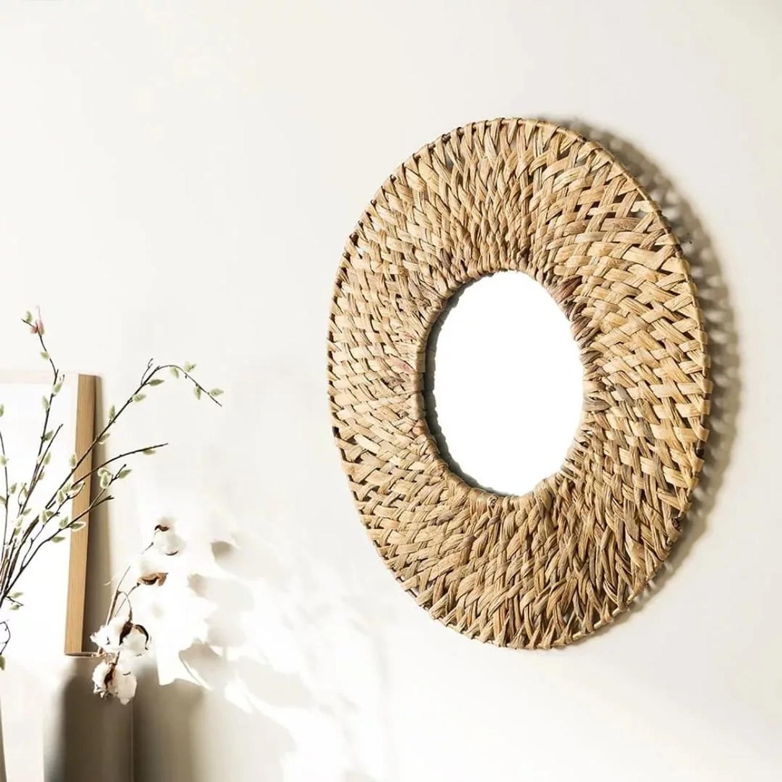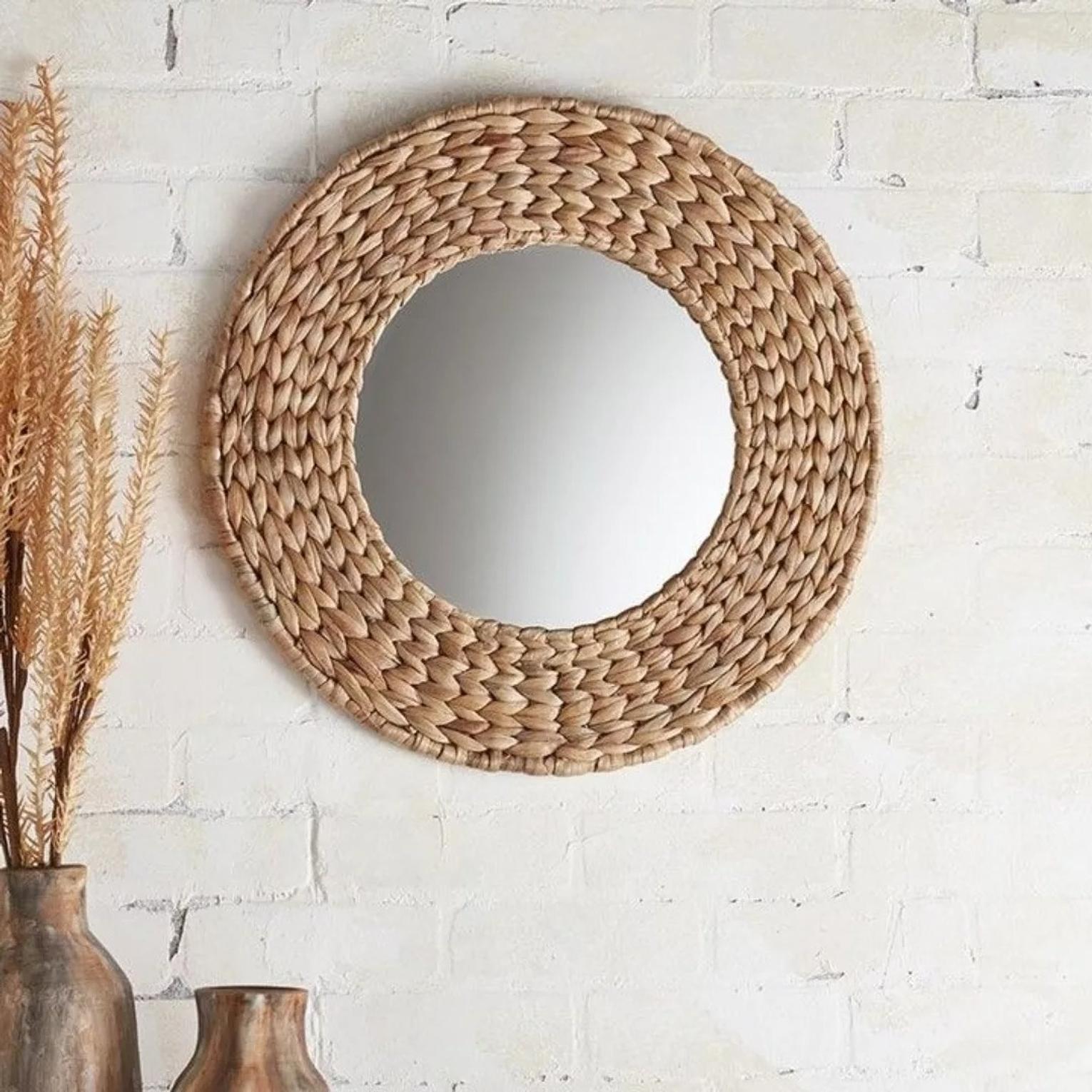 Bring the serene charm of natural textures into your home with the Coastal Rattan Decorative Wall Mirror. This stunning mirror features a generous 60cm diameter, making it an ideal statement piece for hallways, living rooms, bedrooms, or bathrooms. The frame is meticulously handmade from natural water hyacinth, intricately braided to create a rich, tactile border that exudes organic elegance. Each mirror is a unique piece of artisanal craftsmanship, showcasing the beautiful variations in the natural material. The warm, earthy tones of the woven frame perfectly complement a variety of interior styles, from bohemian and coastal to rustic and Scandinavian. Beyond its reflective utility, this mirror acts as a captivating piece of wall art, adding depth, light, and natural character to your chosen space. Easy to hang and designed for lasting beauty, the Coastal Rattan mirror is an essential accent for those seeking natural decorative mirrors, handmade wall decor, bohemian home accents, rattan framed mirrors, and organic interior pieces.