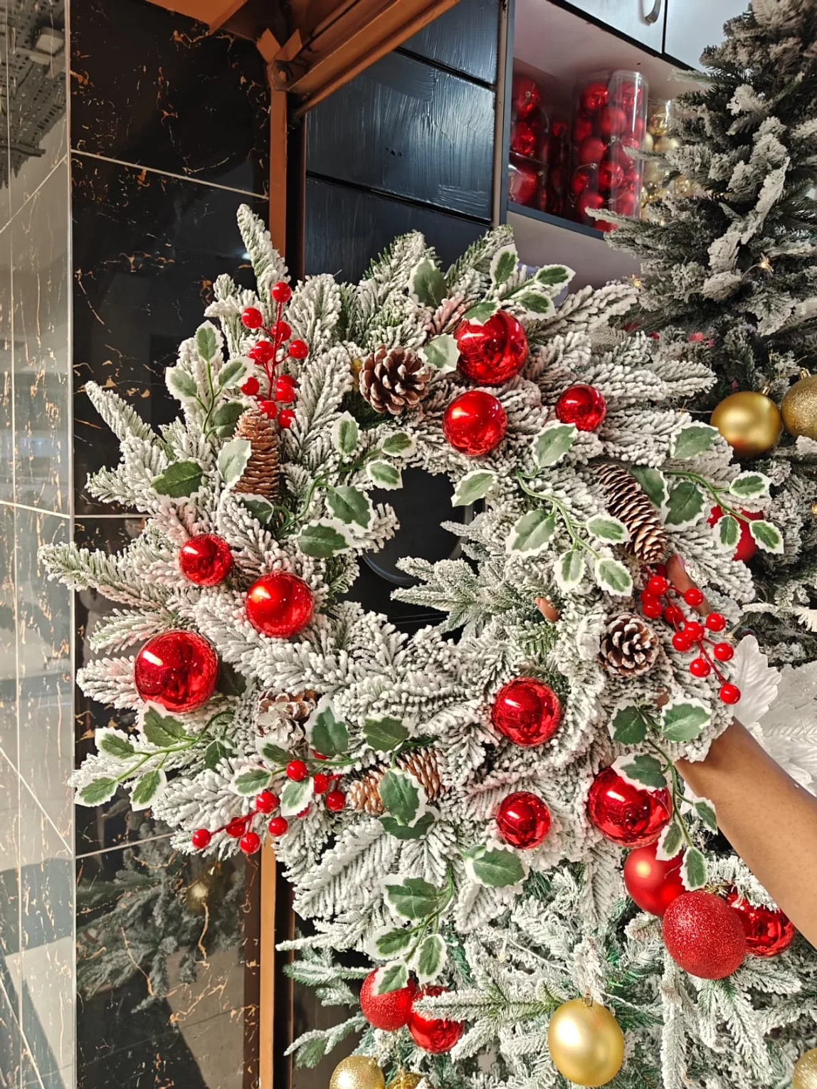 Create a magical, winter wonderland entrance with this high-quality, pre-decorated Christmas wreath. Measuring a substantial 50 cm in diameter, this wreath is built on a lush, dense spruce base that is meticulously snow-flocked to achieve a realistic, icy, and beautiful wintry look.