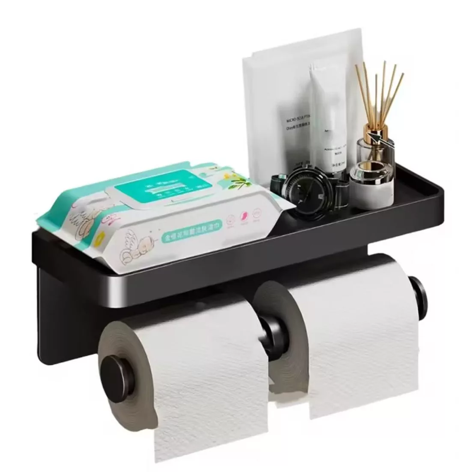 Upgrade your bathroom or kitchen utility with this robust and contemporary double-roll paper holder. Constructed from high-quality aluminum alloy, this unit is designed for long-lasting durability and resistance to moisture. The key feature is the efficient double-roll capacity, ensuring you always have a spare roll readily accessible. Installation is hassle-free thanks to its no-drilling required adhesive mounting system, protecting your walls while providing a secure fixture. An indispensable element is the top storage shelf, perfect for holding wet wipes, small decorative items, mobile phones, or air fresheners, keeping them neatly within reach. Its multipurpose design and sleek aesthetic make it an ideal and practical organizational tool for both washrooms and food preparation areas.