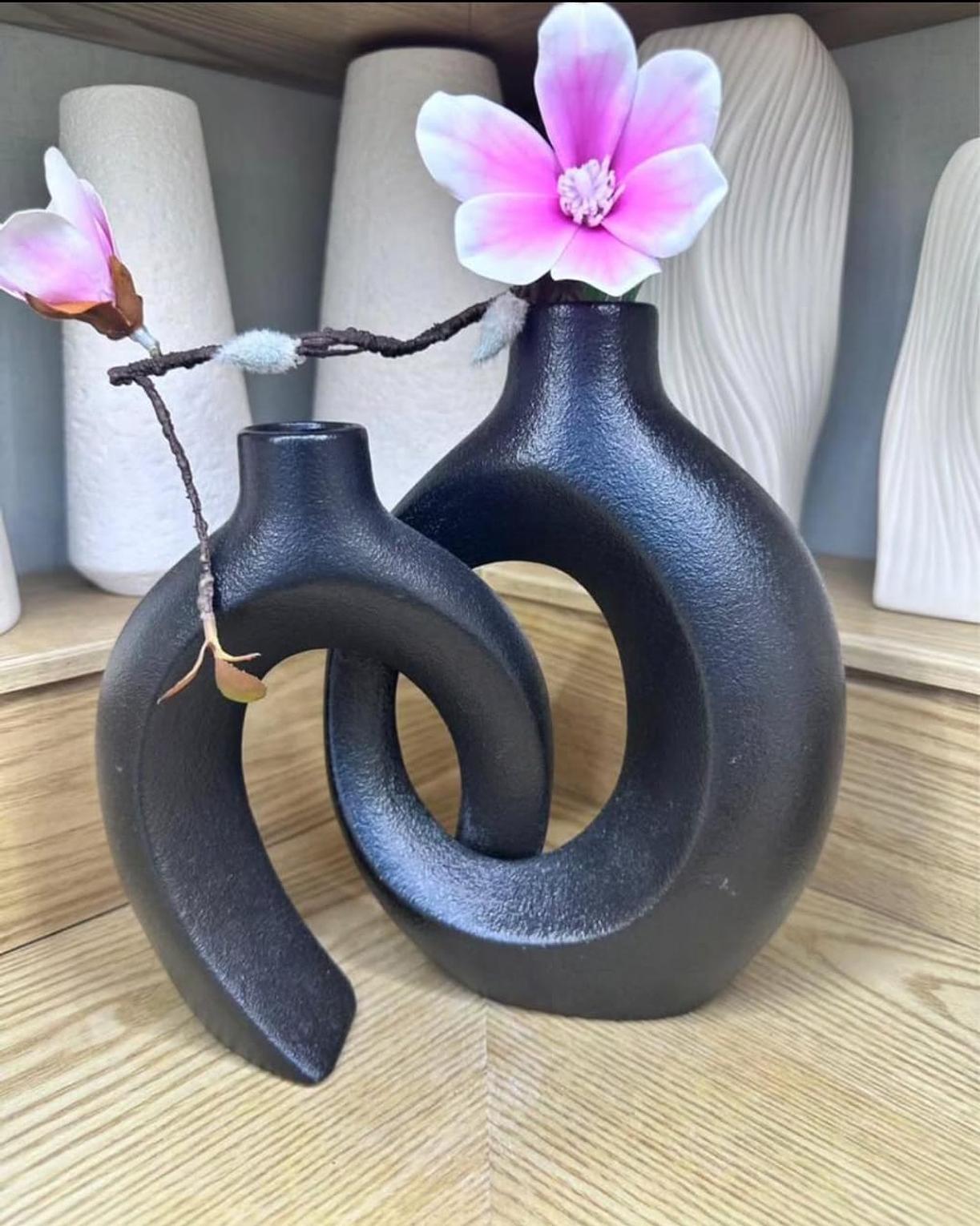 Bring contemporary elegance to your space with the Doughnut Nordic Vase, a striking ceramic piece that seamlessly blends form and function. Its bold, doughnut-shaped design makes a statement, while the smooth ceramic finish enhances its refined, minimalist appeal. Perfect for showcasing flowers or standing alone as a sculptural accent, this vase is ideal for modern interiors. Whether placed on a coffee table, mantelpiece, or shelf, it effortlessly complements a variety of home styles, adding a chic, understated charm. The high-quality ceramic material ensures durability, making this vase a timeless addition to any decor.