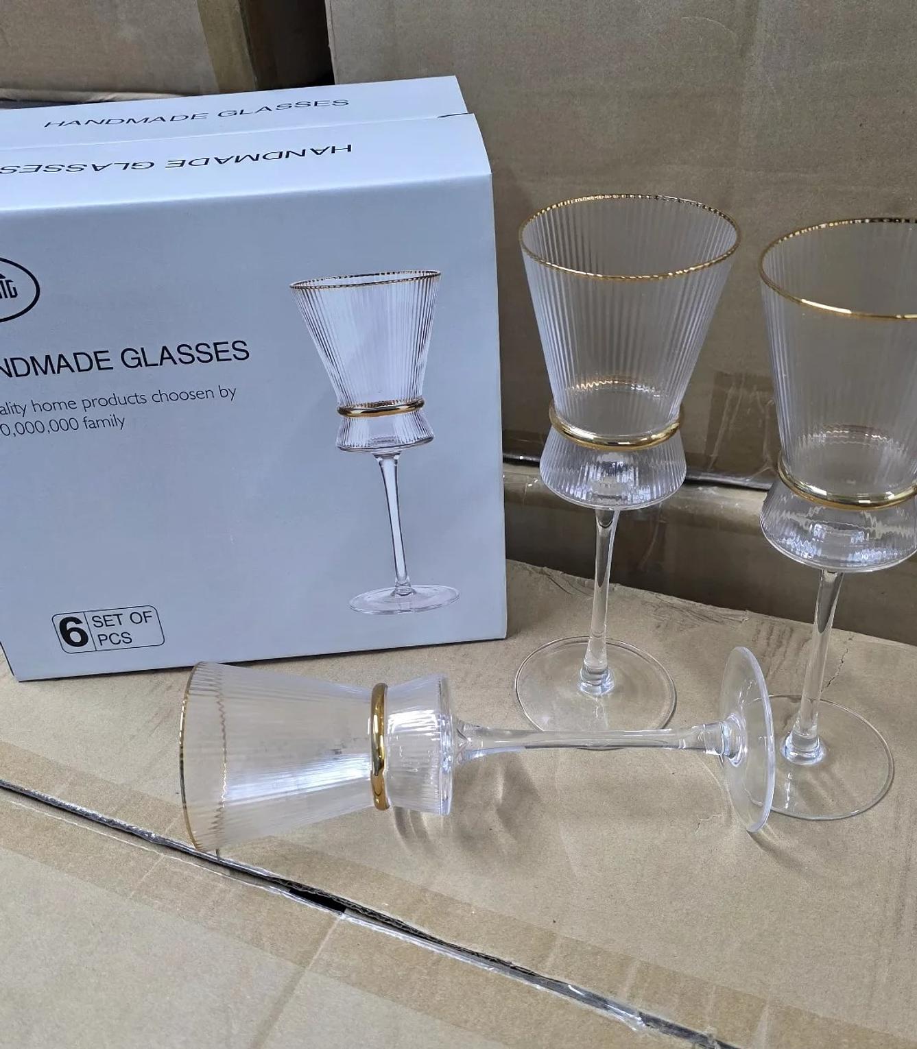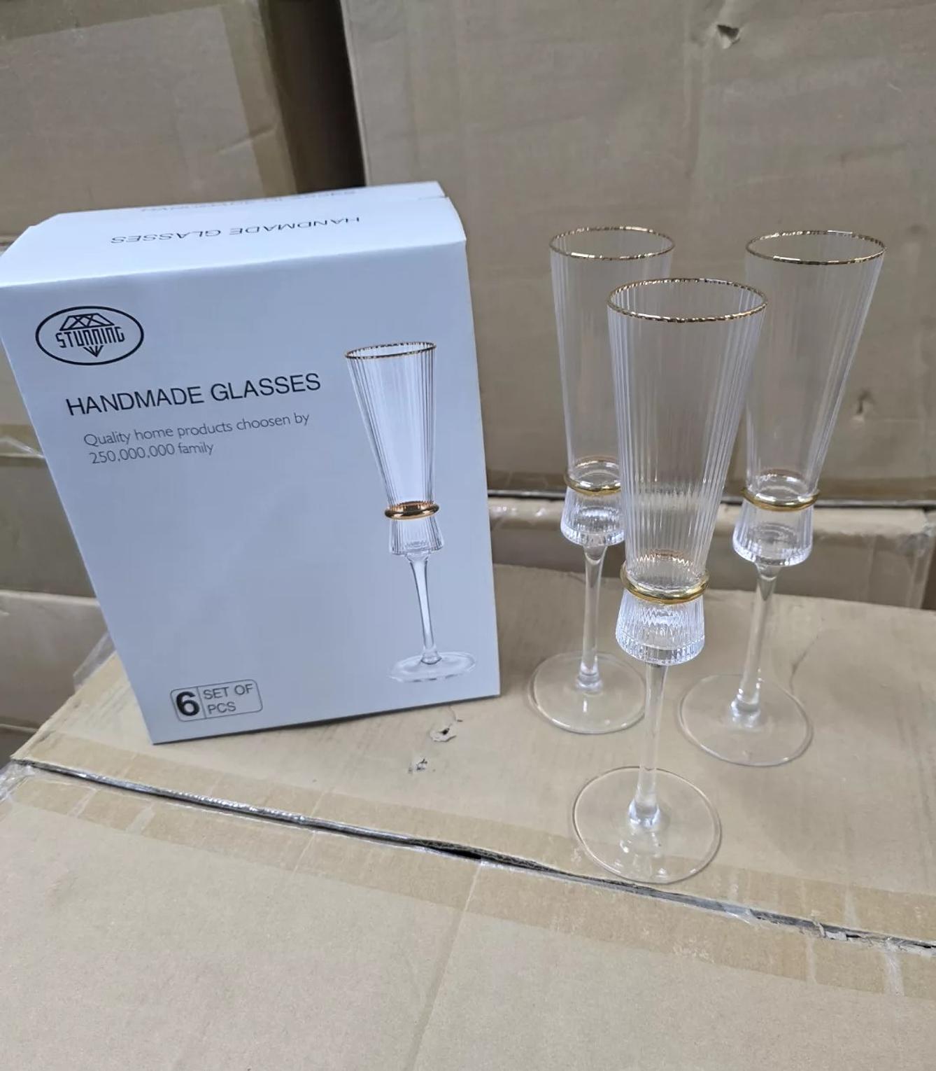 Indulge in tasty sips with our Exquisite Ribbed Crystal Wine & Champagne Flute Set. This stunning 6-piece collection of handmade glasses is designed to bring an unparalleled level of elegance and luxury to your barware. Each glass boasts a unique ribbed texture that beautifully catches the light, creating a dazzling visual effect. The design is further accentuated by a tasteful gold rim and a distinctive gold band at the stem, adding a touch of opulent refinement.