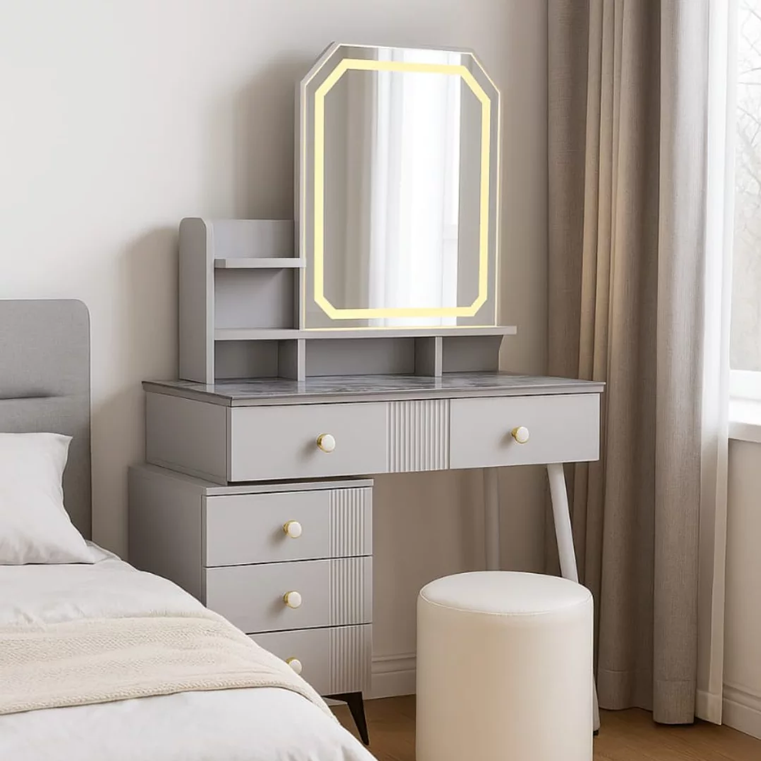 Intelligent Storage: Beyond the main four-drawer chest, the tabletop section includes two additional wide drawers and a shelf unit above the mirror, offering ample, dedicated space for organizing cosmetics, accessories, and décor.