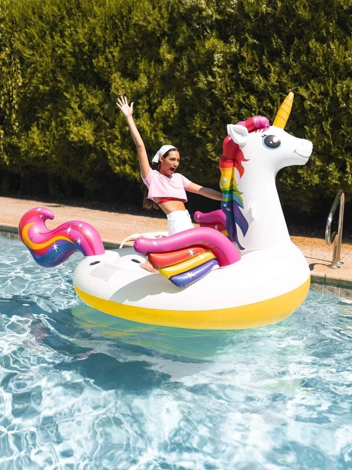 Transform your pool into a fairytale paradise with the Enchanted Giant Rainbow Unicorn Pool Float. This magnificent, extra-large inflatable is designed to capture imaginations with its bright white body, a golden horn, and a flowing mane and tail in all the colors of the rainbow. Measuring an impressive 225cm x 175cm, it offers ample space for comfortable lounging and relaxation for both adults and children. Constructed from durable, high-quality PVC, this unicorn float is built to withstand endless hours of fun while providing a stable platform on the water. For added safety and easy maneuvering, it features strategically placed handles that assist with balance and climbing aboard. It's the perfect accessory for lively pool parties, memorable vacations, or simply capturing stunning, whimsical photos, ensuring every swim day is filled with magic and joy.
