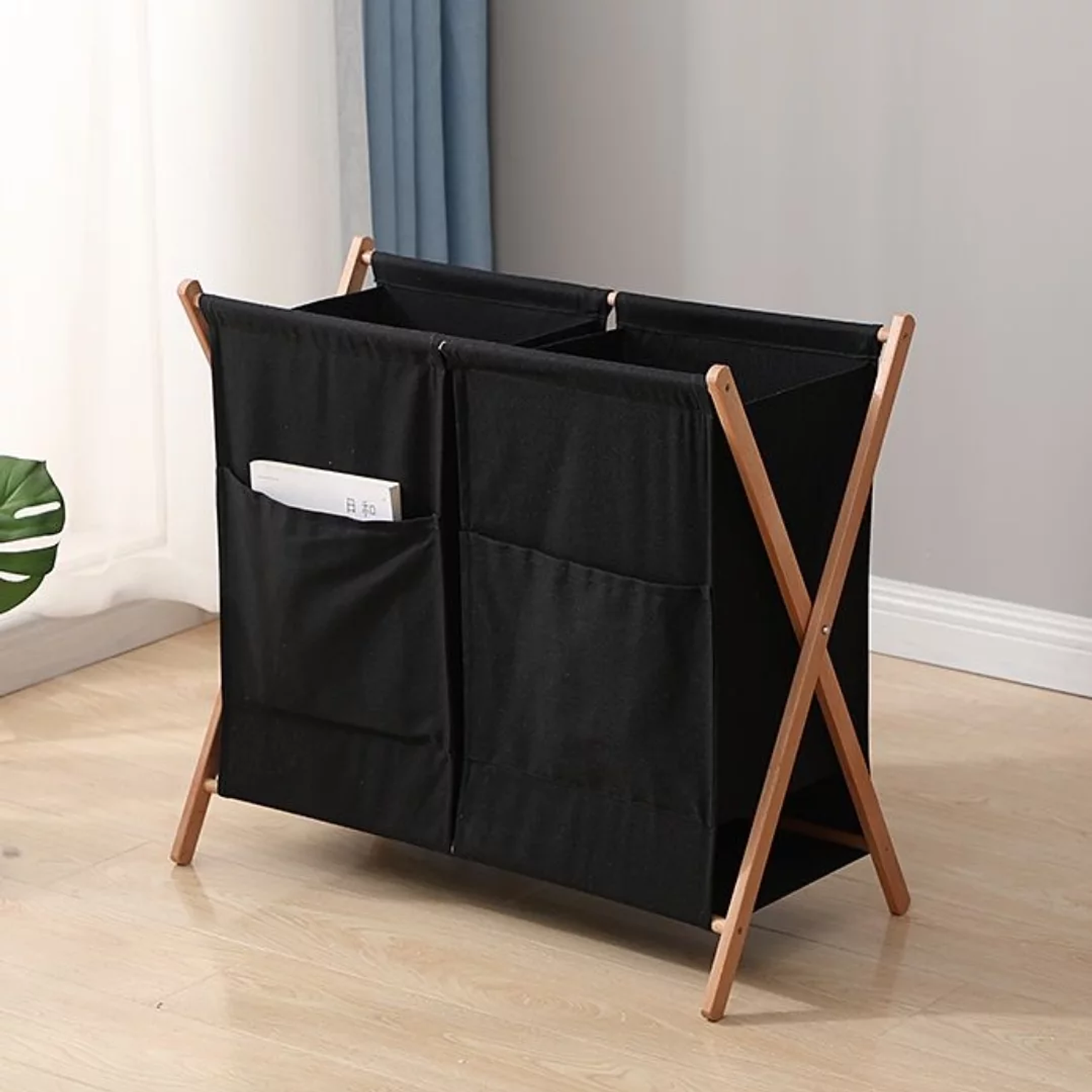 Streamline your laundry routine with this spacious and intelligently designed foldable partitioned laundry basket. The hamper features two separate interior compartments, making it simple to presort clothing into lights and darks, or colors and delicates, saving you time on laundry day. The basket section is supported by a stable and visually appealing wooden cross-frame that gives it a clean, modern aesthetic suitable for any bedroom, closet, or utility room. When not in use, the entire unit collapses flat for convenient storage, making it perfect for smaller living spaces. With generous dimensions of 62 cm×52 cm×30 cm, this organizer offers substantial capacity while maintaining a lightweight and easily portable structure.