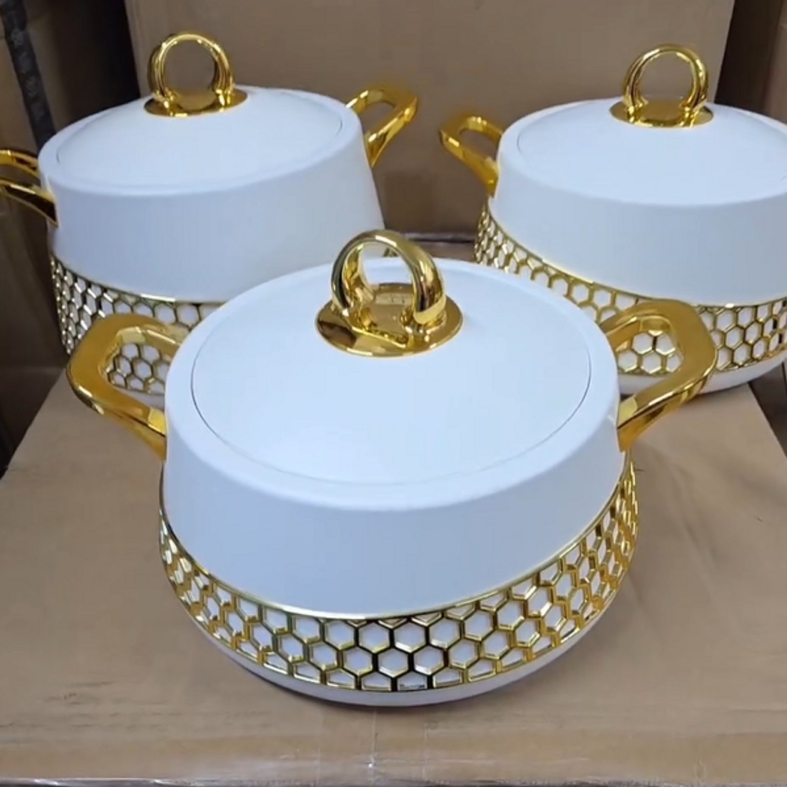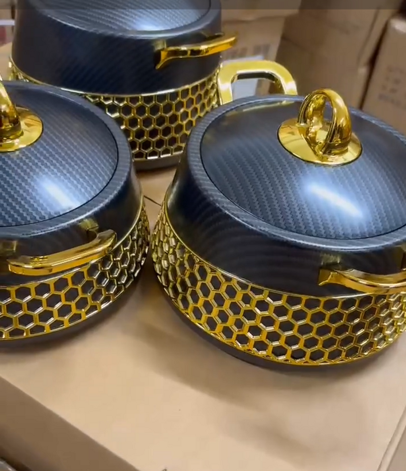 Elevate your dining and entertaining with the exquisite GoldenHoneycomb Thermal Casserole Set, a testament to both opulent design and exceptional functionality. This set of three includes versatile capacities of approximately 2L, 2.5L, and 3L, making it ideal for serving a variety of dishes, from intimate family meals to grand gatherings. Each casserole features a striking combination of a sleek, dark carbon-fiber look exterior complemented by a unique, textured gold honeycomb band around the base and luxurious gold-finished handles and lids. Crafted from premium quality stainless steel, these food warmers are engineered for superior performance, guaranteeing to keep your food hot for up to 7 hours. This remarkable insulation ensures that your dishes retain their ideal temperature, flavor, and freshness, allowing you to prepare meals in advance and serve them at their peak. Beyond their stunning aesthetic, these casseroles are also durable and easy to clean, making them a practical and long-lasting addition to any kitchen. Perfect for buffets, potlucks, or simply keeping dinner warm until everyone is ready, the GoldenHoneycomb Thermal Casserole Set is an essential for hosts who value both elegance and efficiency.
