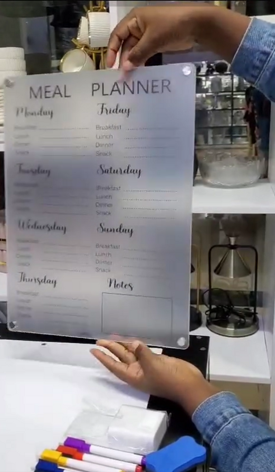 Streamline your weekly meal planning and keep your household organized with our Premium Magnetic Acrylic Meal Planner for Refrigerator. Sized perfectly at 30x40cm, this elegant and functional planner adheres securely to any magnetic surface, transforming your fridge into a central hub for family organization. Crafted from high-quality, transparent acrylic, it offers a modern, minimalist aesthetic that complements any kitchen decor.