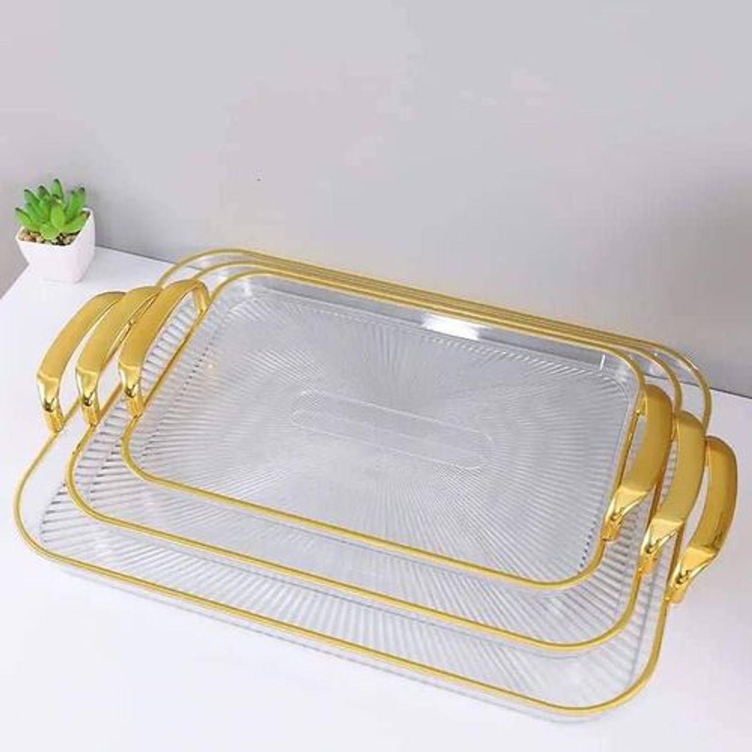 This 3-piece collection of acrylic serving trays is designed to combine striking visual appeal with high functionality for modern living. Each tray features a clear base with a subtle, textured radial pattern, framed by a lustrous gold border. The durable, contrasting gold-tone handles are ergonomically shaped, allowing for secure and comfortable transport of food, beverages, or decorative items. Their nesting design ensures effortless storage when not in use. These versatile trays are perfect for use in dining rooms as serveware, or on coffee tables and vanities as decorative organizational pieces, adding a sophisticated, contemporary flair to any interior space in the surrounding locale.