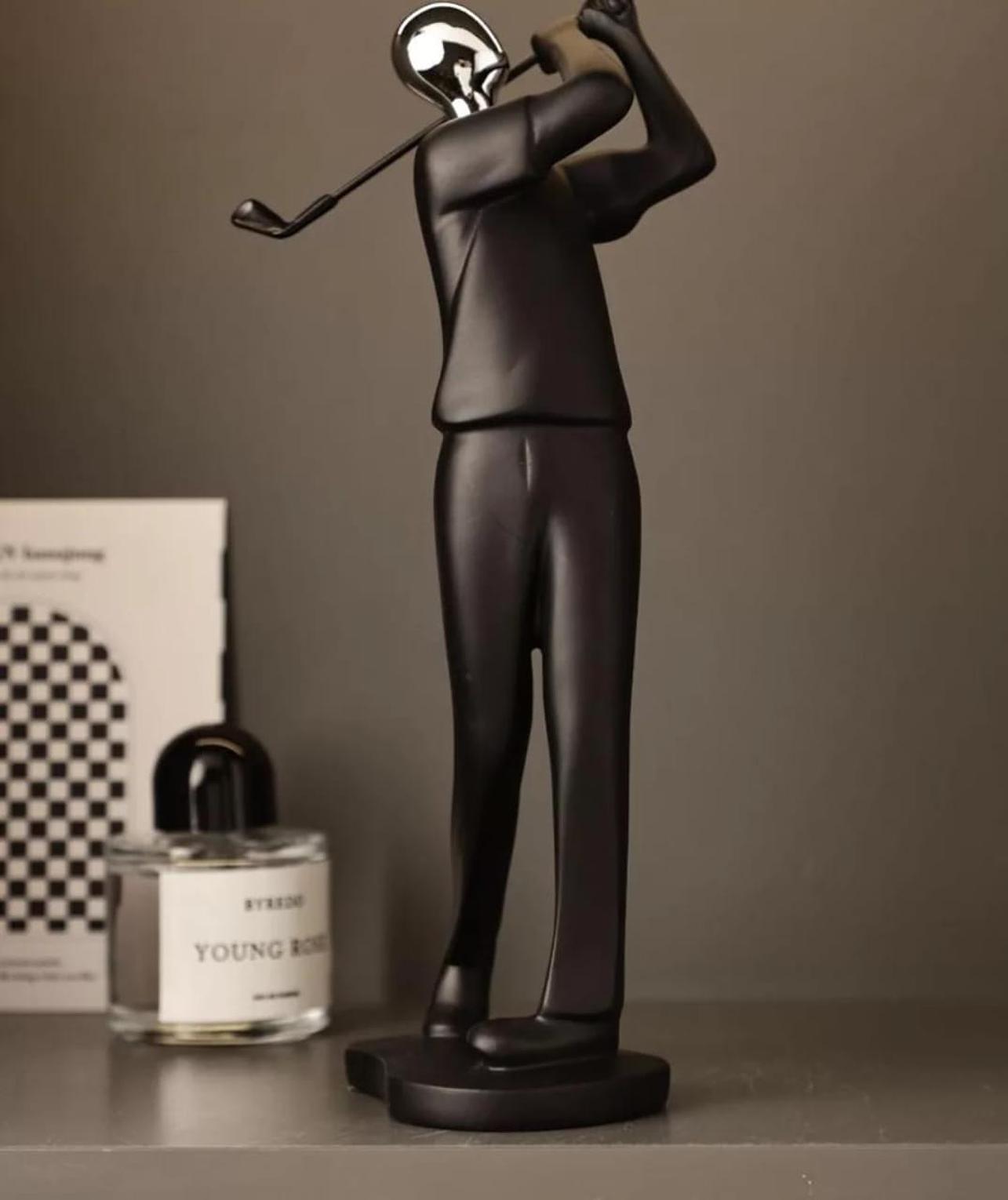 Celebrate the sport of golf with this beautifully crafted ceramic golfer sculpture. Expertly designed to convey motion and grace, the piece showcases a golfer in mid-swing, bringing energy and life to any space. The smooth ceramic finish and detailed features make this decor piece a sophisticated addition to your home, office, or game room. Whether displayed on a mantle, bookshelf, or desk, it adds a touch of elegance and passion for the game. A perfect gift for golf lovers or a stylish way to highlight your own appreciation for the sport, this sculpture combines art and athleticism in a striking form.