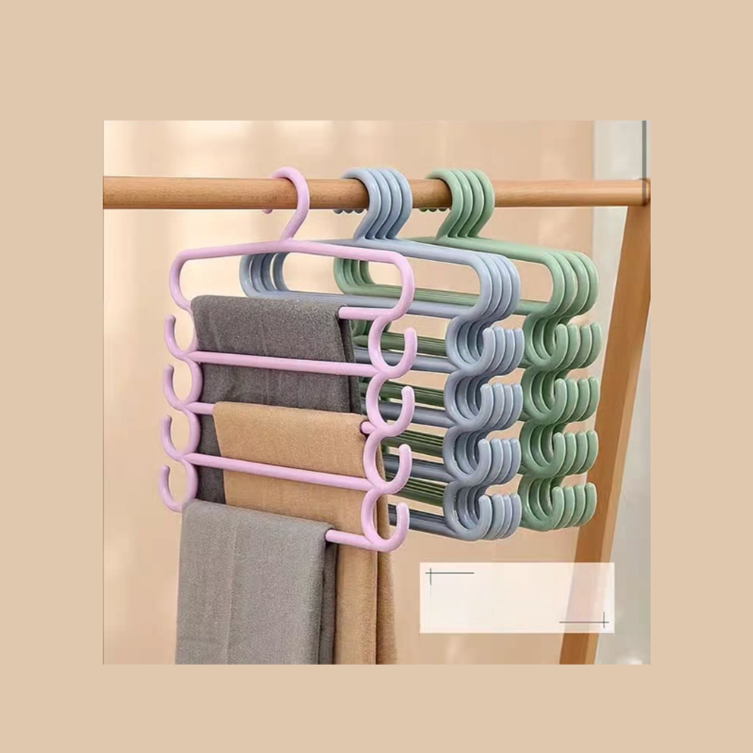 Maximize closet space with this heavy-duty, multi-layer hanger, designed to hold multiple pairs of trousers, jeans, or scarves vertically. Its robust construction keeps garments neat and wrinkle-free. Available in Blue, Green, and Pink.