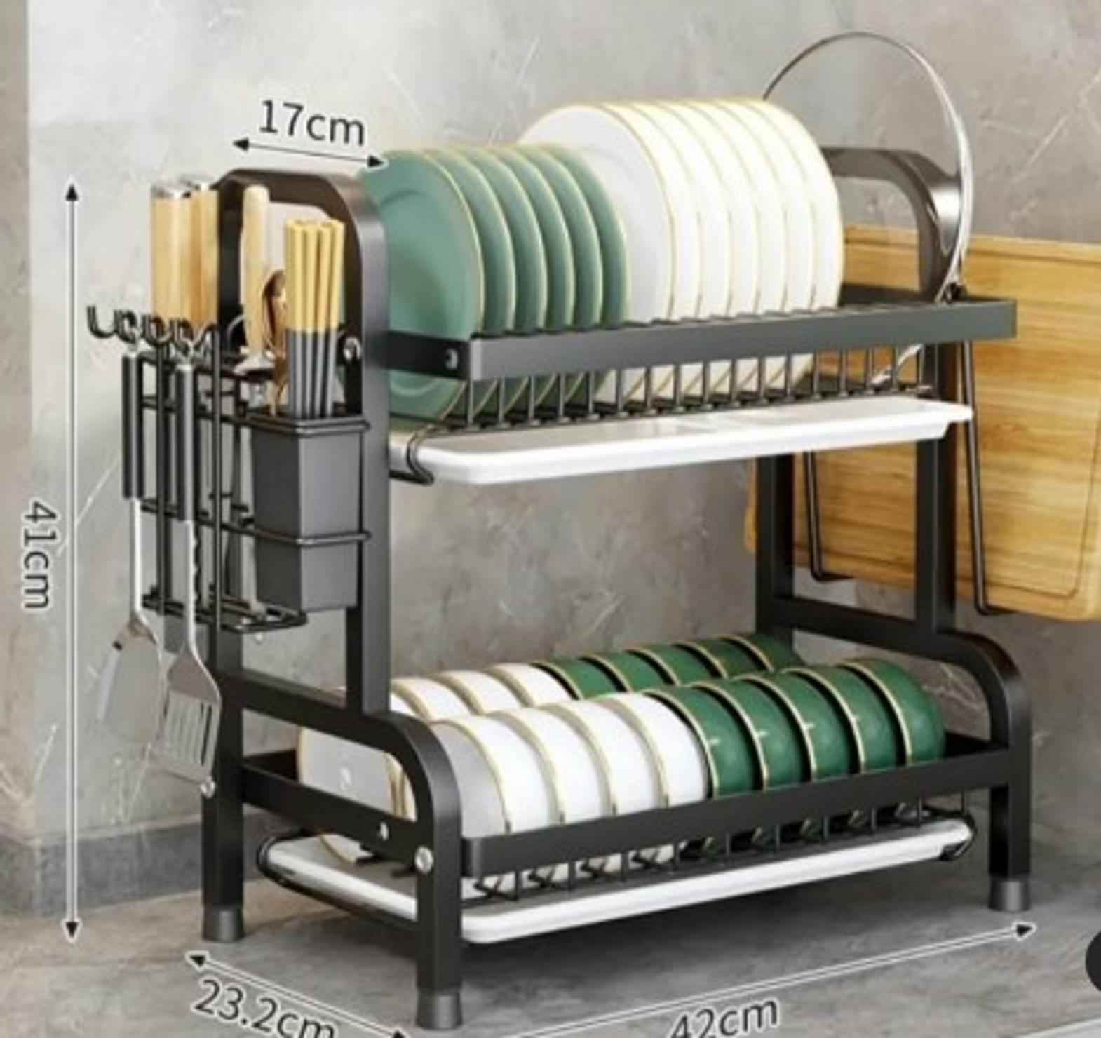 This premium 2-tier dish rack is crafted with heavy-duty materials, offering both strength and elegance for your kitchen. The dual-layer design provides ample space to dry dishes, bowls, and mugs, while the dedicated cutlery holder ensures organized utensil storage. Its sturdy construction resists rust and wear, making it ideal for daily use, while the drip tray underneath keeps your countertops clean and dry. With a sleek, modern design that blends seamlessly into any kitchen decor, this dish rack is perfect for families or individuals who value practicality and style in their kitchen essentials.