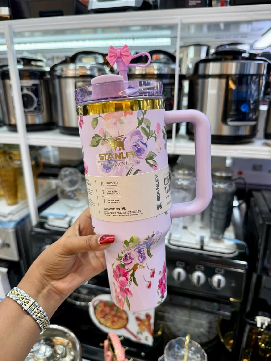 pink roses, purple flowers , light blue flowers , pink green flowers.