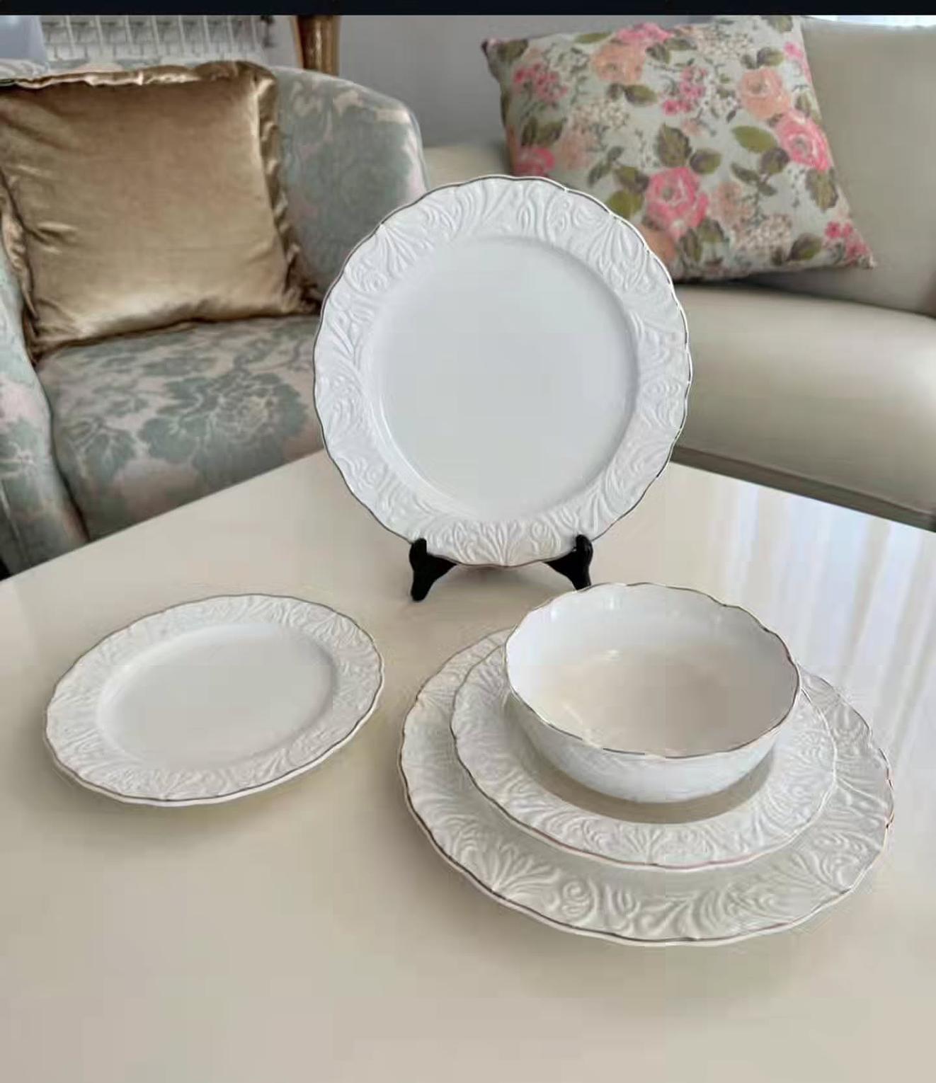 Introduce refined luxury to your dining experience with the Nordic Embossed 24-Piece Porcelain Dinner Set. Each piece in this exquisite collection is crafted from high-quality white porcelain, featuring delicate, traditional embossing that provides a rich, tactile surface. A tasteful, slender gold rim encircles the edges, adding a touch of opulent detailing to the overall aesthetic. This comprehensive set is designed to serve six people completely, containing 6 full-sized Dinner Plates, 6 versatile Side Plates, 6 generously deep Salad or Pasta Bowls, and 6 essential Soup Bowls. This elegant dinnerware is styled after classic European designs, making it an ideal choice for formal gatherings, holiday feasts, or simply transforming a standard family dinner into a distinguished occasion. The durable finish ensures these pieces remain cherished components of your home for years to come.