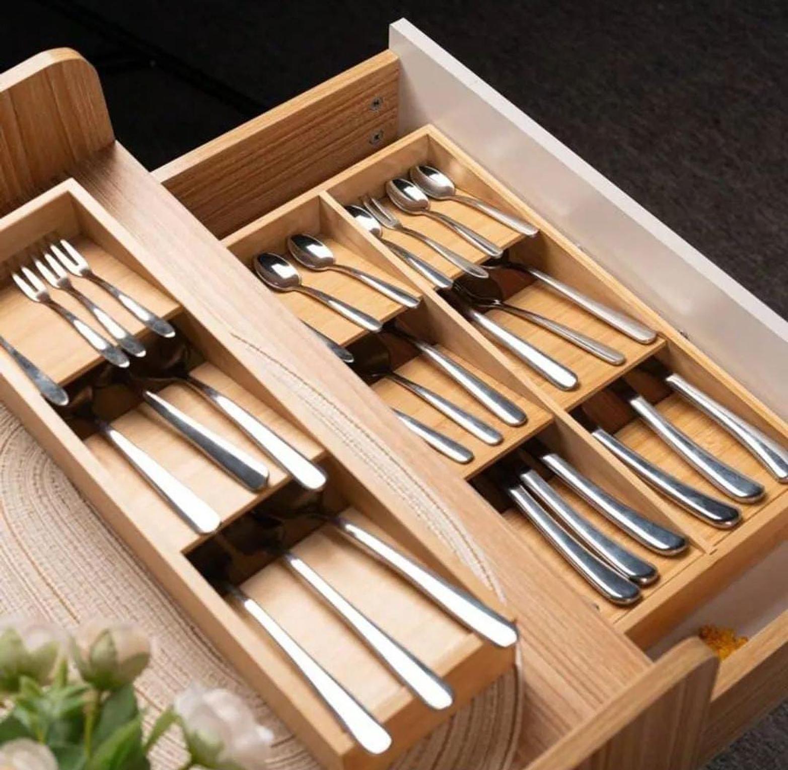 Upgrade your kitchen organization with our 6-slot bamboo cutlery organizer, designed to bring order and elegance to your utensil drawer. Crafted from sustainable bamboo, this organizer offers a sturdy, eco-friendly way to keep your cutlery, tools, and small kitchen essentials neatly arranged. Each of the six compartments provides ample space, making it easy to find what you need while adding a touch of natural warmth to your kitchen. Its expandable design ensures it fits perfectly into most drawers, adapting to your storage needs with ease. Take advantage of this special offer and enjoy a more organized, stylish kitchen with a durable bamboo organizer that combines functionality with environmentally conscious materials.