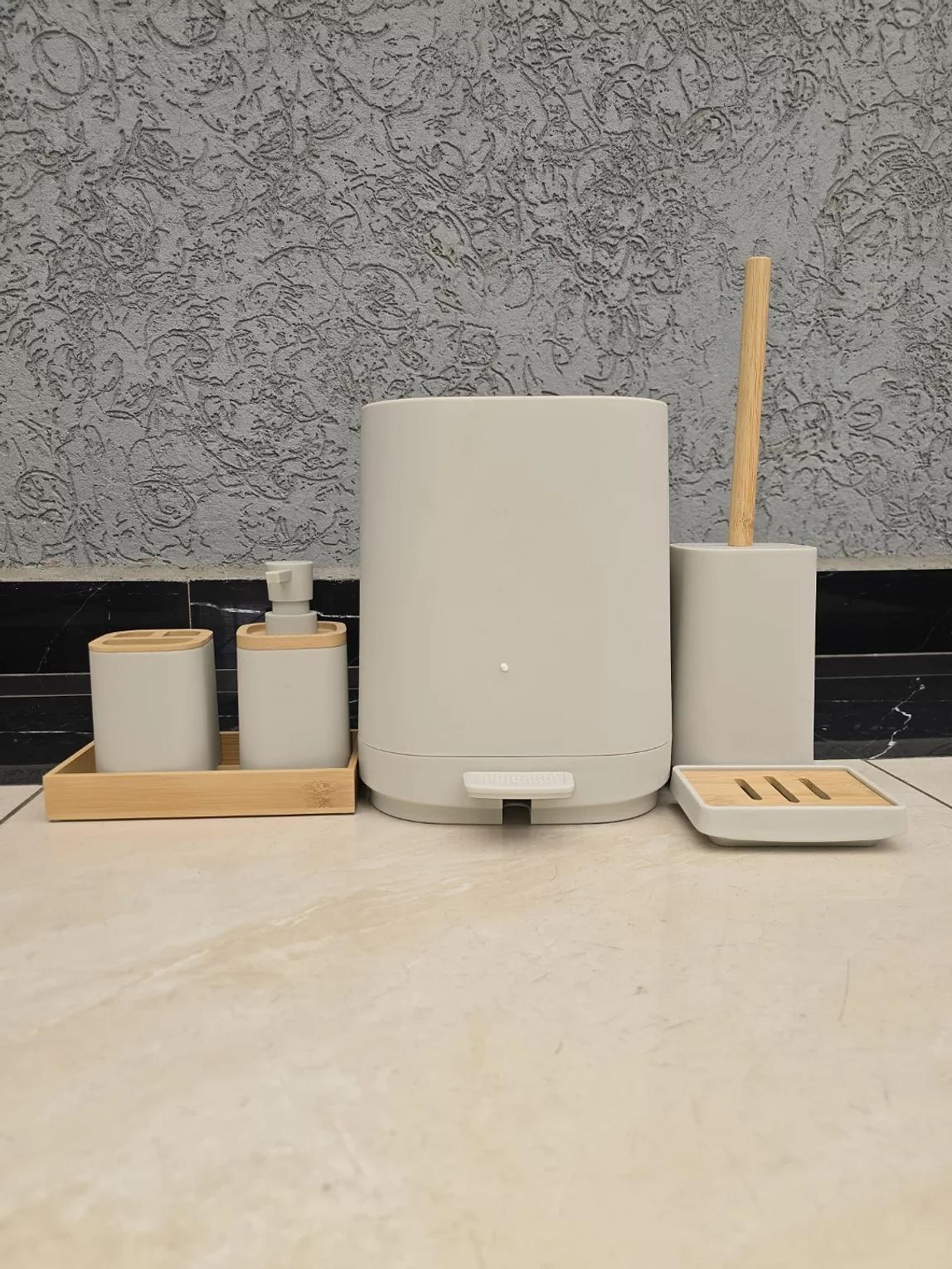 Elevate the sophistication and functionality of your bathroom with the Elegance Ease 6-Piece Bathroom Accessory Set. This meticulously curated collection provides a complete solution for bathroom organization, blending practical utility with sleek design. The set includes a toothbrush holder cup, a liquid soap dispenser, a soap dish, a trash can with a convenient pedal, a tumbler, and a toilet brush with its holder, ensuring every essential is beautifully coordinated. Each piece is constructed from very high-quality, environmentally friendly PP material, offering exceptional durability, resistance to moisture, and effortless cleaning. The design emphasizes clean lines and a smooth finish, providing a modern and elegant aesthetic that complements a wide array of bathroom decors. The inclusion of a pedal-operated trash can adds a hygienic and hands-free convenience. Available in versatile colors including black, white, beige, and grey, this set allows you to customize your bathroom's look while maintaining a cohesive and clutter-free environment. This comprehensive accessory set is a must-have for those seeking luxury bathroom accessories, modern bathroom sets, eco-friendly bath decor, complete vanity sets, and stylish toilet brush holders.