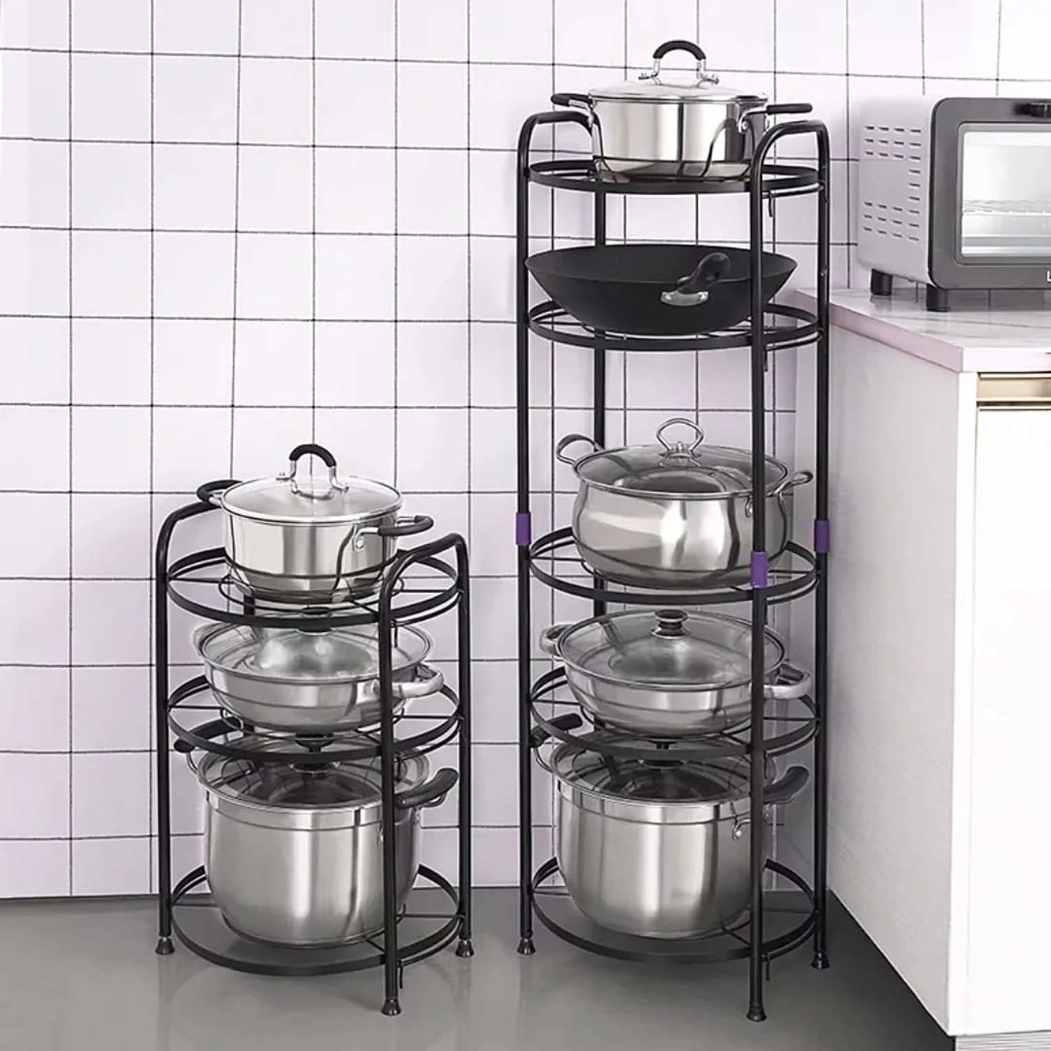 Reclaim cabinet space and organize your cookware efficiently with this excellent quality, vertical 5-tier pot rack holder. Constructed entirely from heavy-duty metal, this organizer is engineered for exceptional strength and durability, while its finish ensures it is non-rust, making it a long-lasting addition to your food preparation area. Standing at a convenient height of 103 cm with a diameter of 36 cm, the circular design fits neatly into corners or alongside cabinets, utilizing vertical space effectively. The rack's open shelves provide easy access to all your pots, pans, and lids, and the integrated side loops are perfect for hanging cooking utensils. Available in a sleek black color, it combines high functionality with a modern, clean aesthetic.
