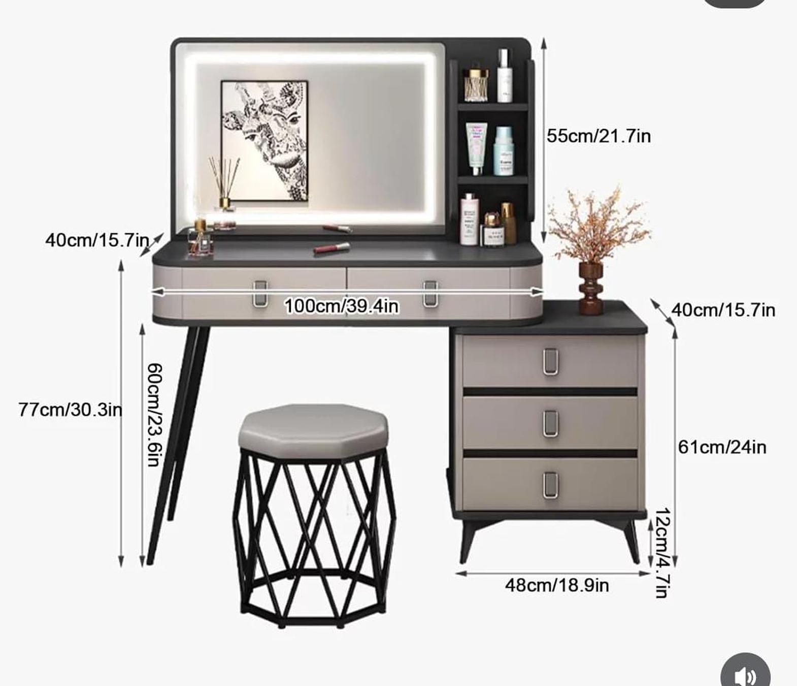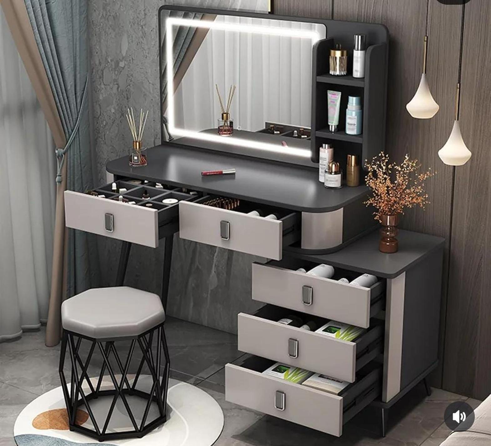 This retractable dressing table combines modern elegance with practical innovation, featuring a sleek design that saves space while keeping your beauty essentials organized. The built-in LED light offers soft, adjustable illumination, ensuring perfect lighting for makeup application or grooming at any time of day. Its retractable structure allows you to extend it when in use and neatly tuck it away when not needed, making it ideal for compact bedrooms or apartments. With well-designed storage compartments and a refined finish, this dressing table is both a statement piece and a functional must-have for a polished daily routine.