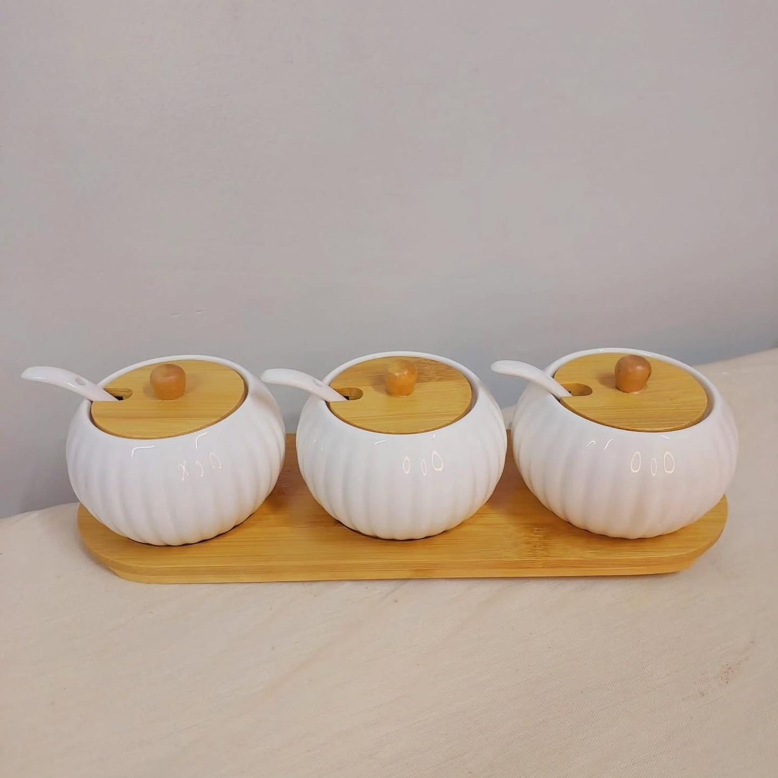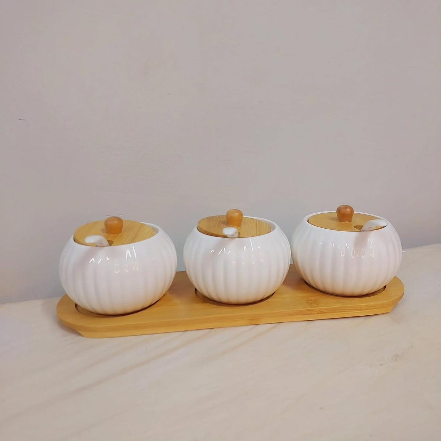 Organize your kitchen counter or dining table with this elegant 3-Piece Ceramic Seasoning Canister Set with Bamboo Tray and Spoons. This set includes three high-grade porcelain canisters, each designed to hold your essential seasonings. Each canister comes with a natural bamboo lid for an airtight seal, keeping your spices fresh, along with a dedicated ceramic serving spoon.