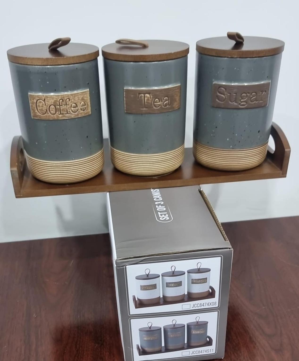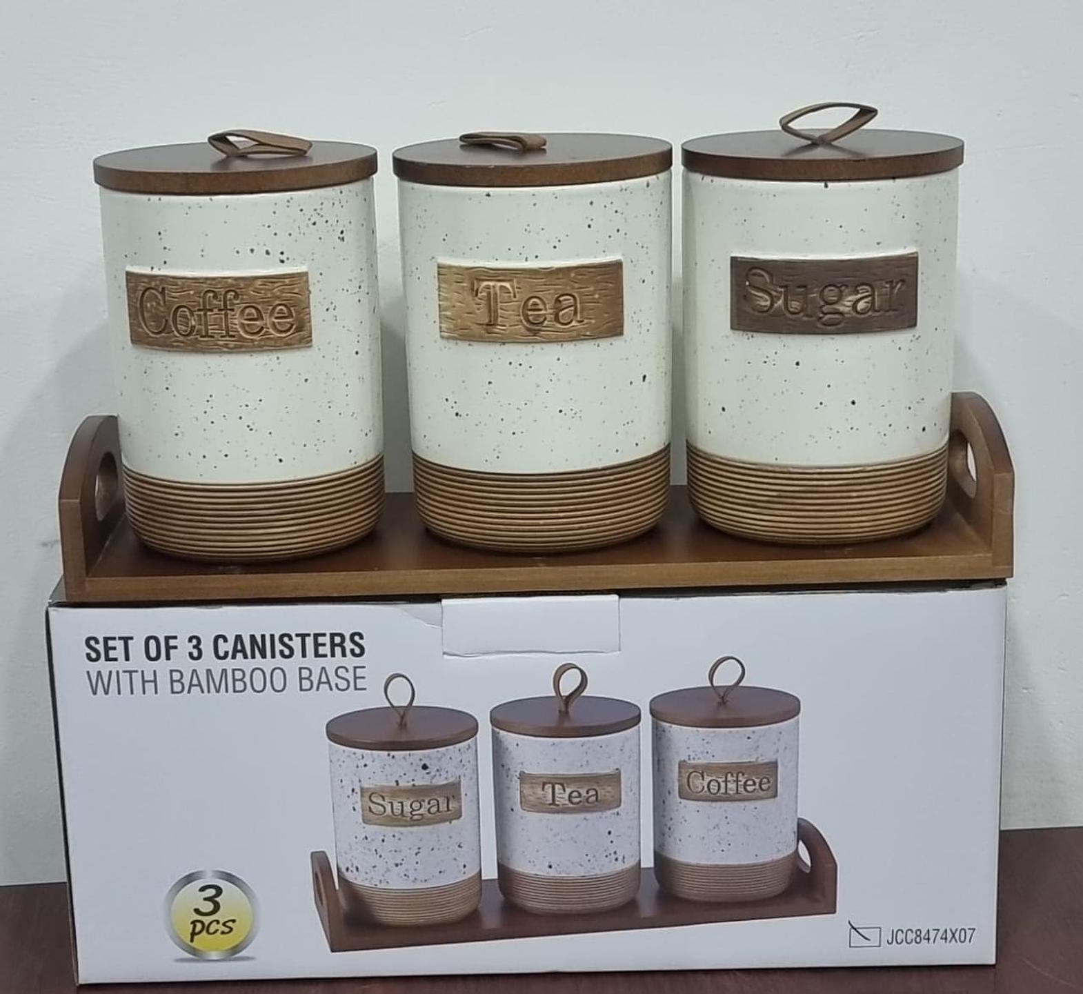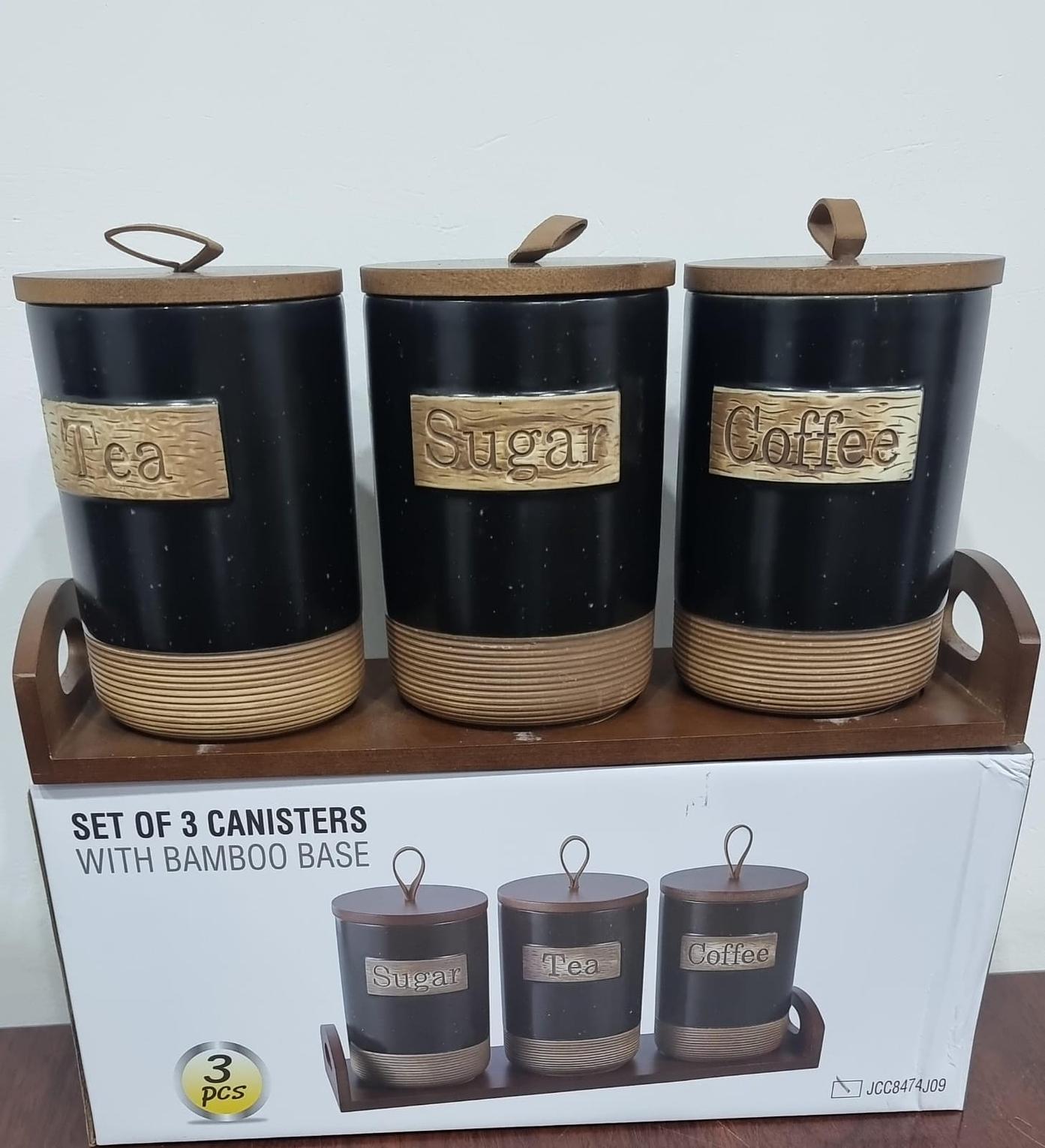 The Set of 3 Ceramic Canisters is perfect for storing sugar, tea, and coffee while keeping your kitchen countertops neat and elegant. These high-quality ceramic canisters come with a bamboo base, offering both durability and style. Each canister is labeled for easy identification and equipped with a secure lid to keep contents fresh. The sleek, minimalist design with the natural bamboo accents adds a touch of modern sophistication to any kitchen decor, making it an ideal choice for organized and aesthetic storage.