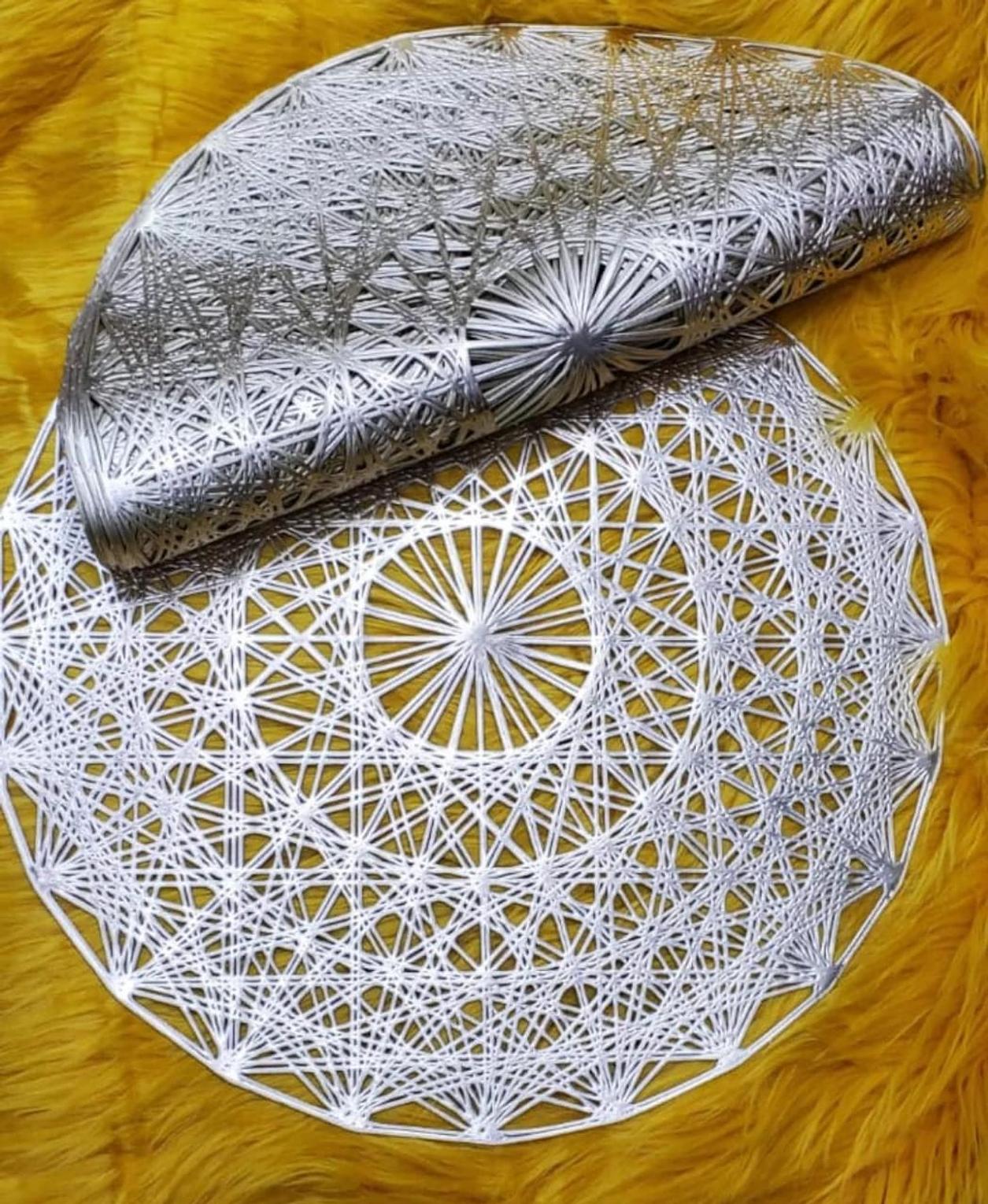 Enhance your dining experience with these sophisticated silver round-shaped PVC table mats, combining elegance with practicality. Crafted from high-quality PVC, these mats offer heat resistance, water resistance, and effortless maintenance, making them perfect for everyday use or special occasions. The intricate design adds a modern touch to any table setting while protecting surfaces from spills, stains, and scratches. Their non-slip texture ensures stability, keeping plates and glassware securely in place. Whether for formal dinners or casual meals, these mats provide a blend of luxury and functionality, elevating your dining decor with a sleek metallic finish.
